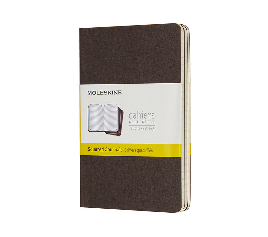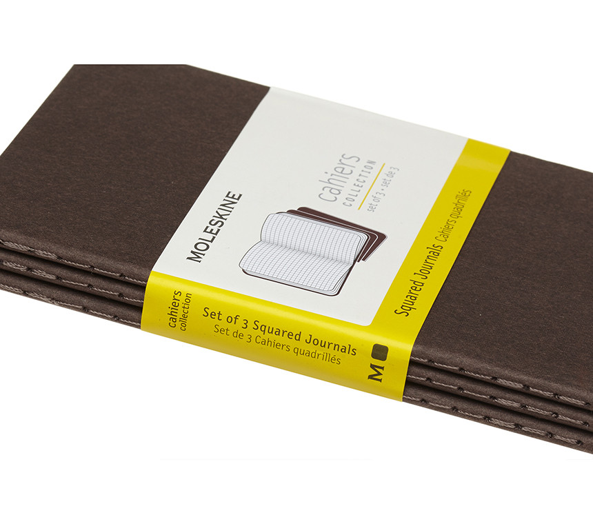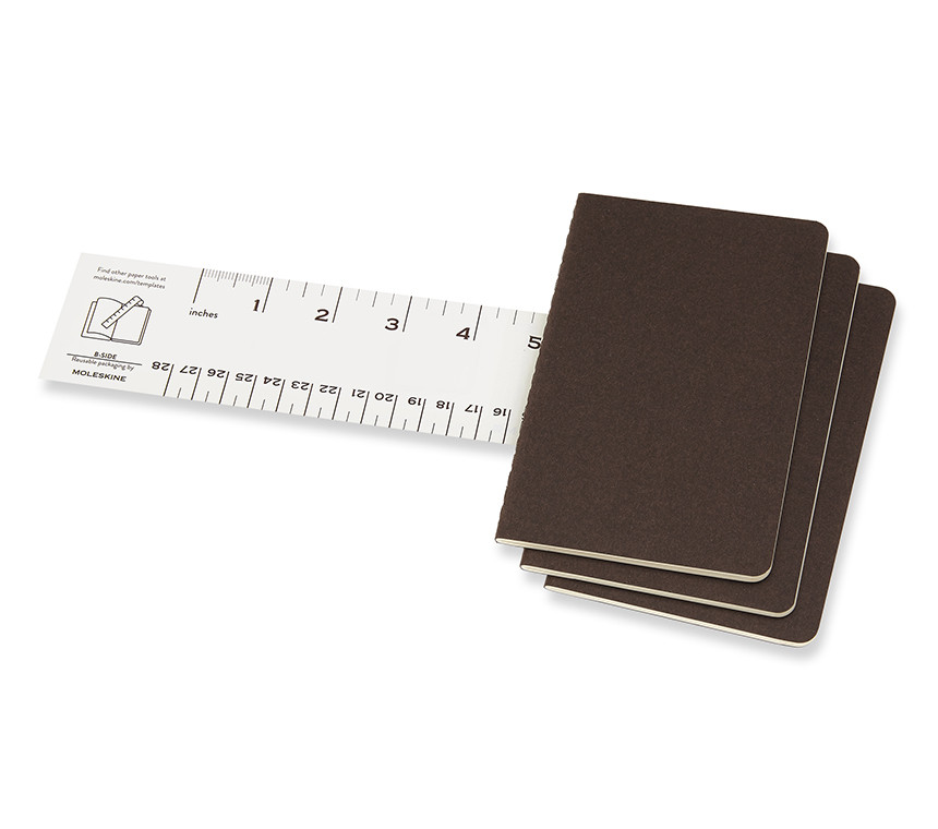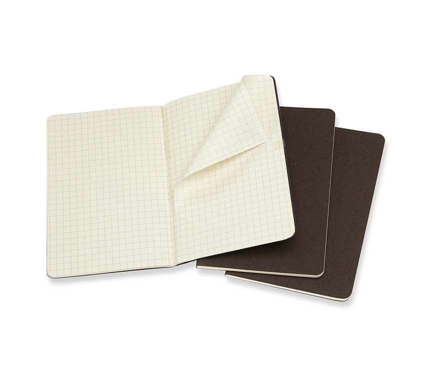 Les cahiers ont la couverture en carton épais brun café avec couture visible au dos. Les dernières 16 pages sont détachables et, à l'intérieur, il y a une large pochette pour gardes feuilles et feuillets, contenant un texte qui raconte l'histoire de Moleskine. Papier sans chlore et pages quadrillées. Set de 3 cahiers.