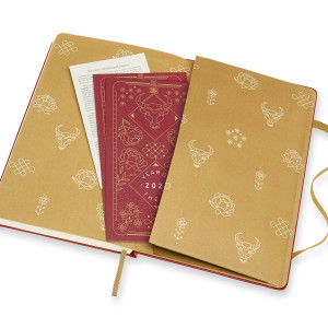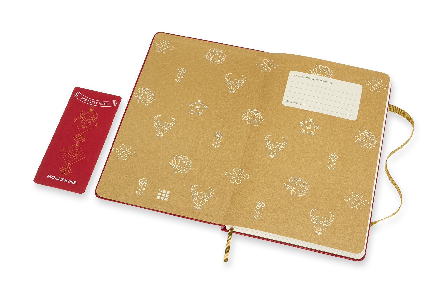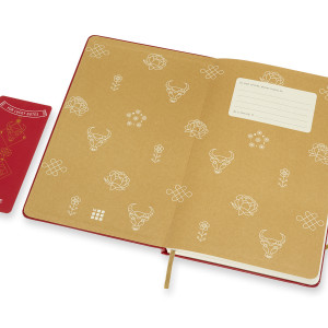 Die zum Thema passenden Grafiken und Symbole für Glück setzen sich auf den Vorsatzblättern im Inneren fort; jedes Notizbuch bietet ausserdem zwei glückbringende rote Briefumschläge, um Familienmitgliedern und Freunden beim kommenden Frühlingsfest Glück zu wünschen. Die Papierbanderole ist auf der Rückseite mit einem Lesezeichen "Jahr des Ochsen" zum Ausschneiden, Ausmalen und Behalten versehen.
