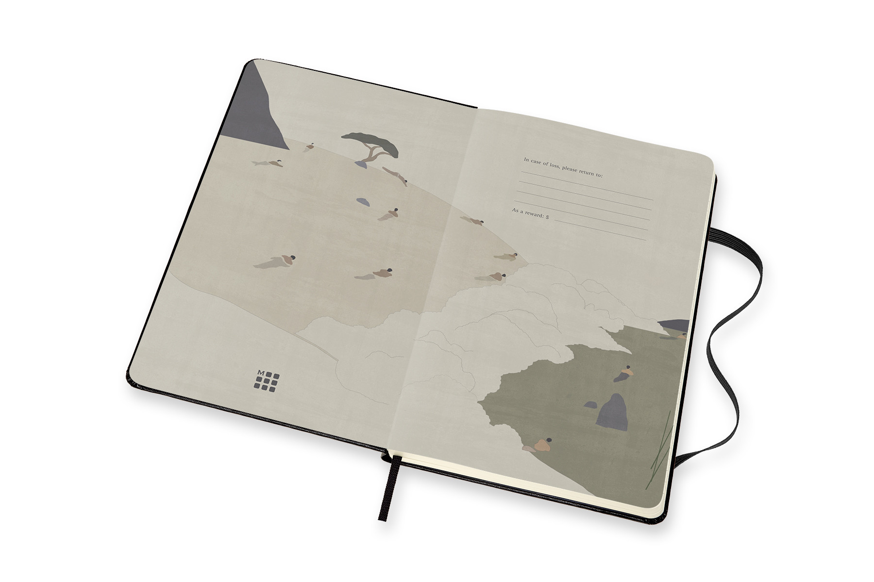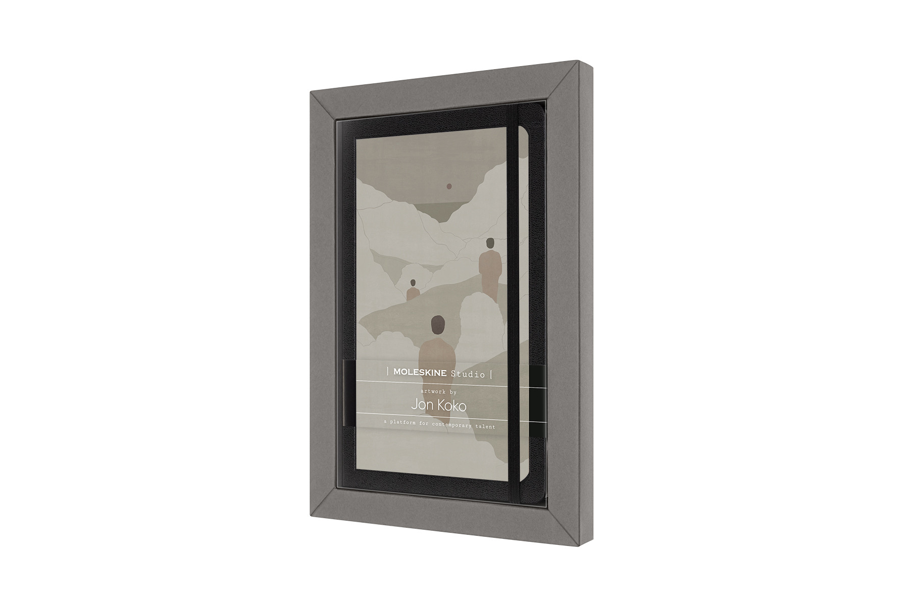 Jedes Notizbuch wird in einer hübschen Box verkauft, die den Einband des Notizbuchs ansprechend einrahmt. Die Box wurde für maximale Inspiration und minimale Verschwendung gestaltet und enthält eine Kopie des Kunstwerks hinter dem Notizbuch zusammen mit dem Namen des Künstlers und des gezeigten Werks. Dank zwei diskreter Öffnungen auf der Rückseite lässt sich die Box wie ein Bilderrahmen aufhängen.