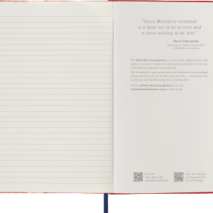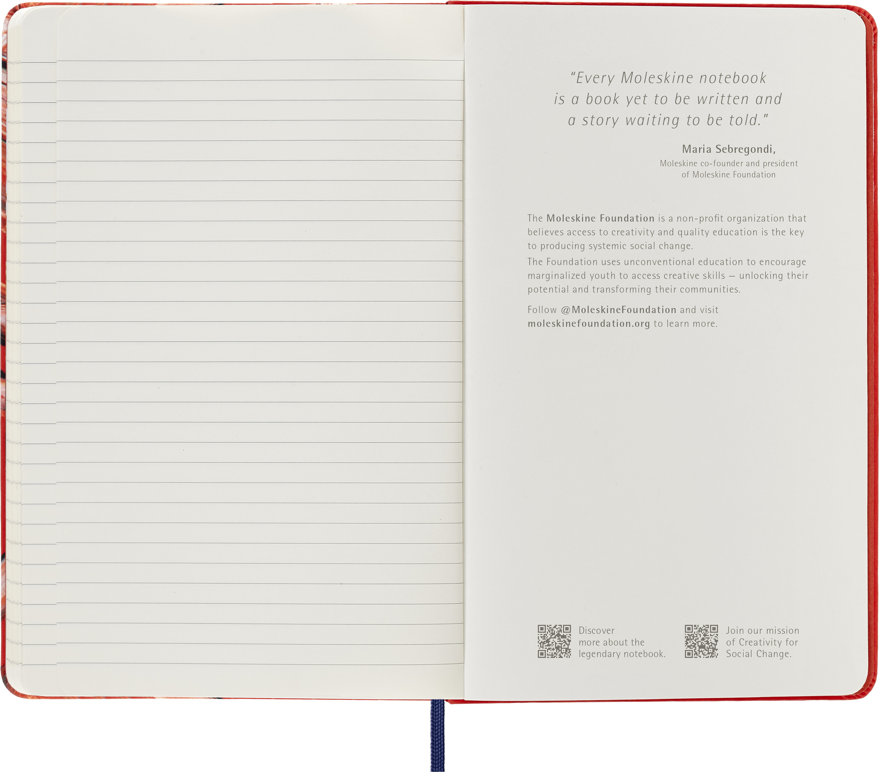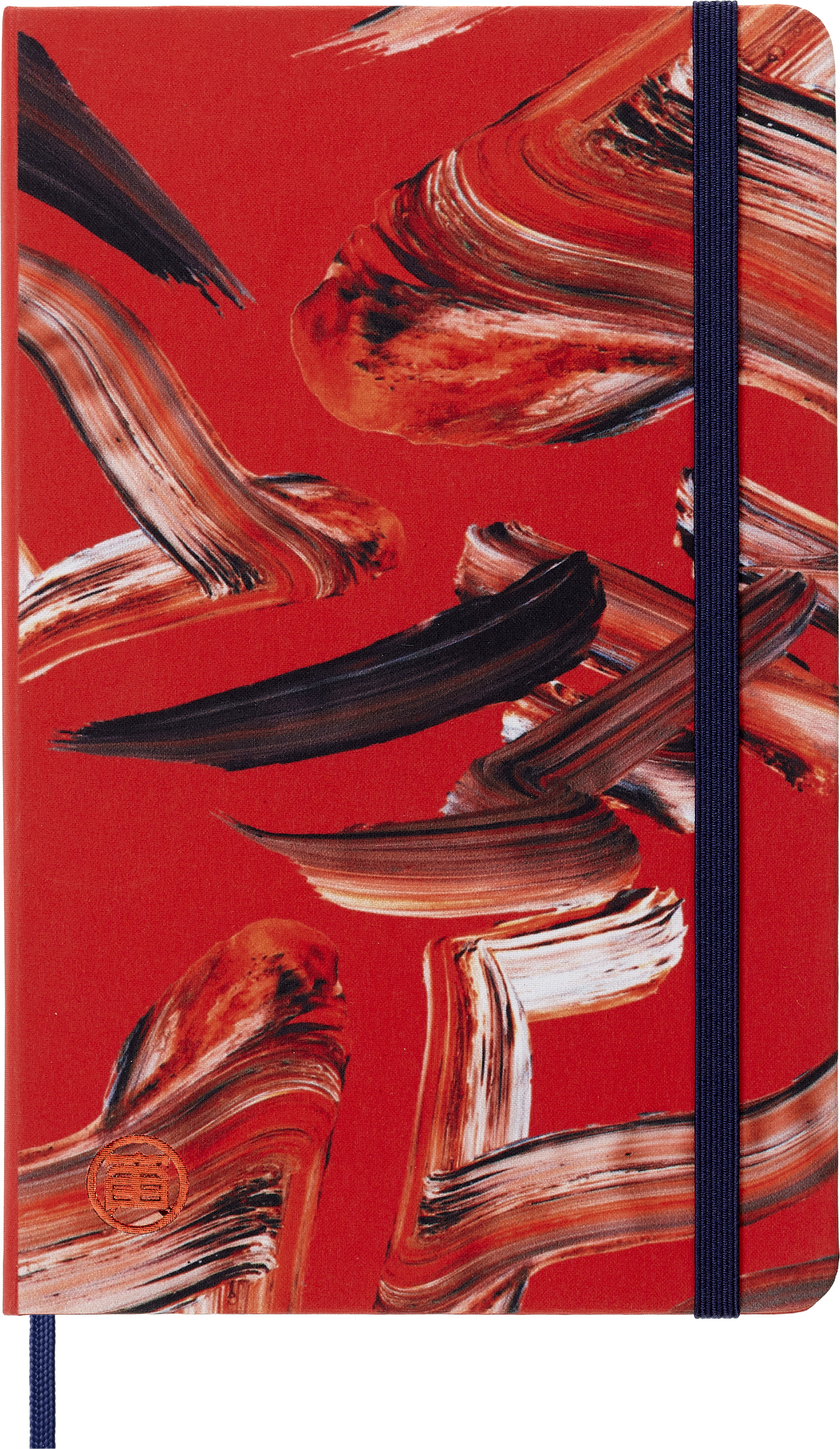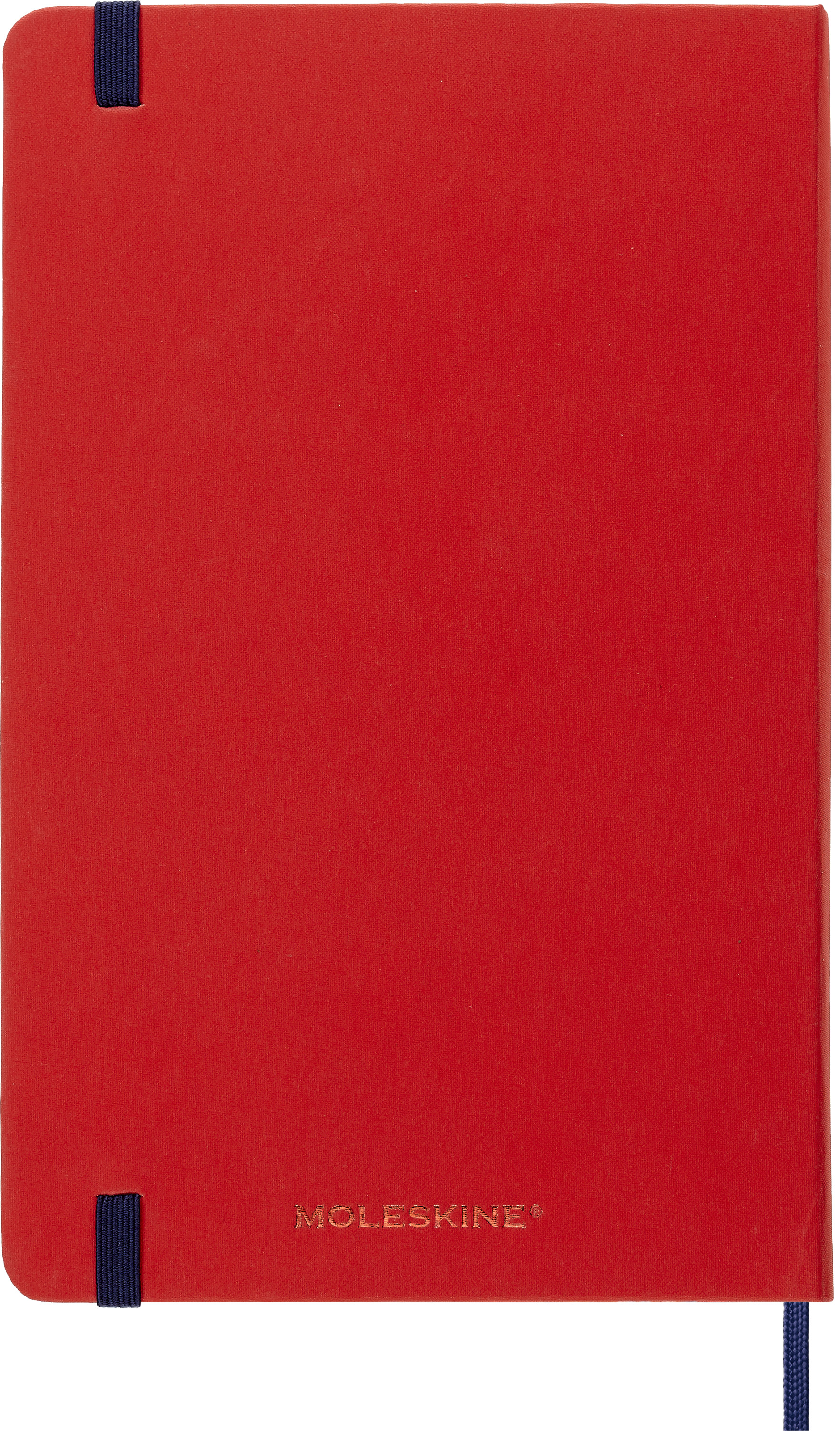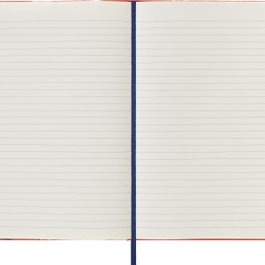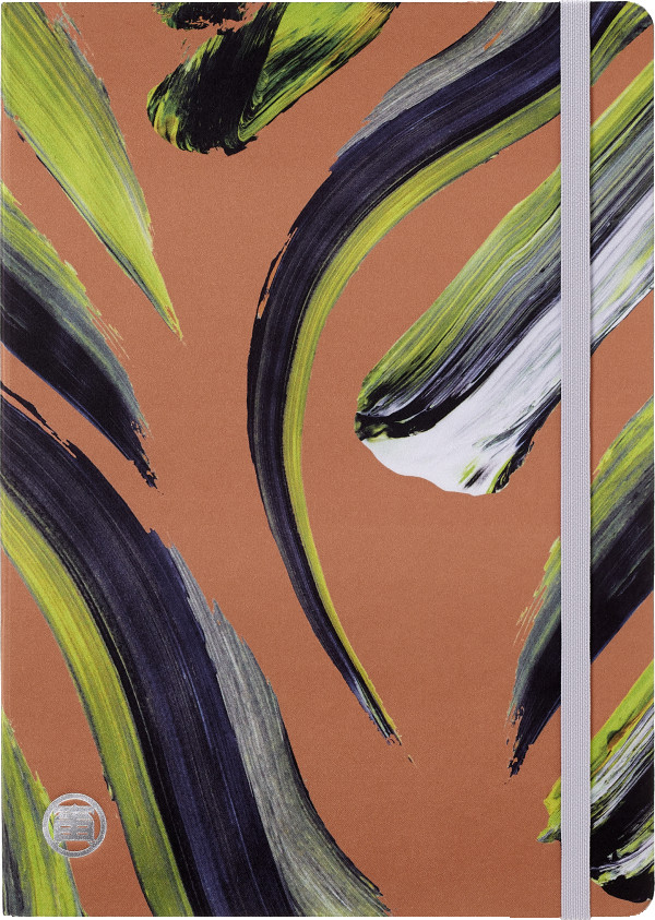 - fester Stoffeinband mit thematisch abgestimmten Grafikelementen und Details, abgerundeten Ecken und Gummiband zum Verschliessen