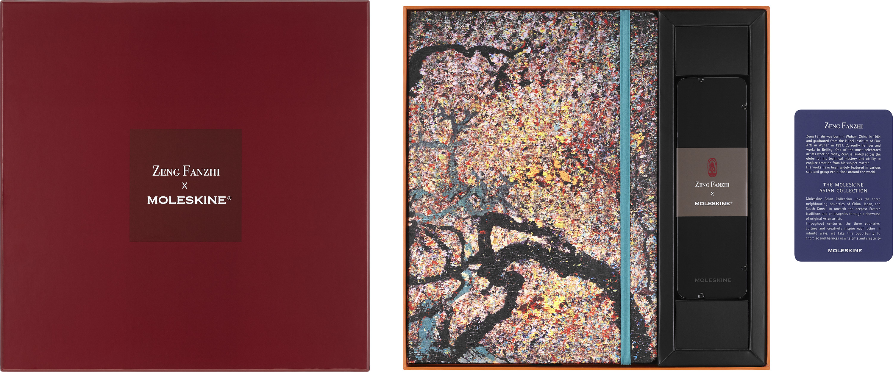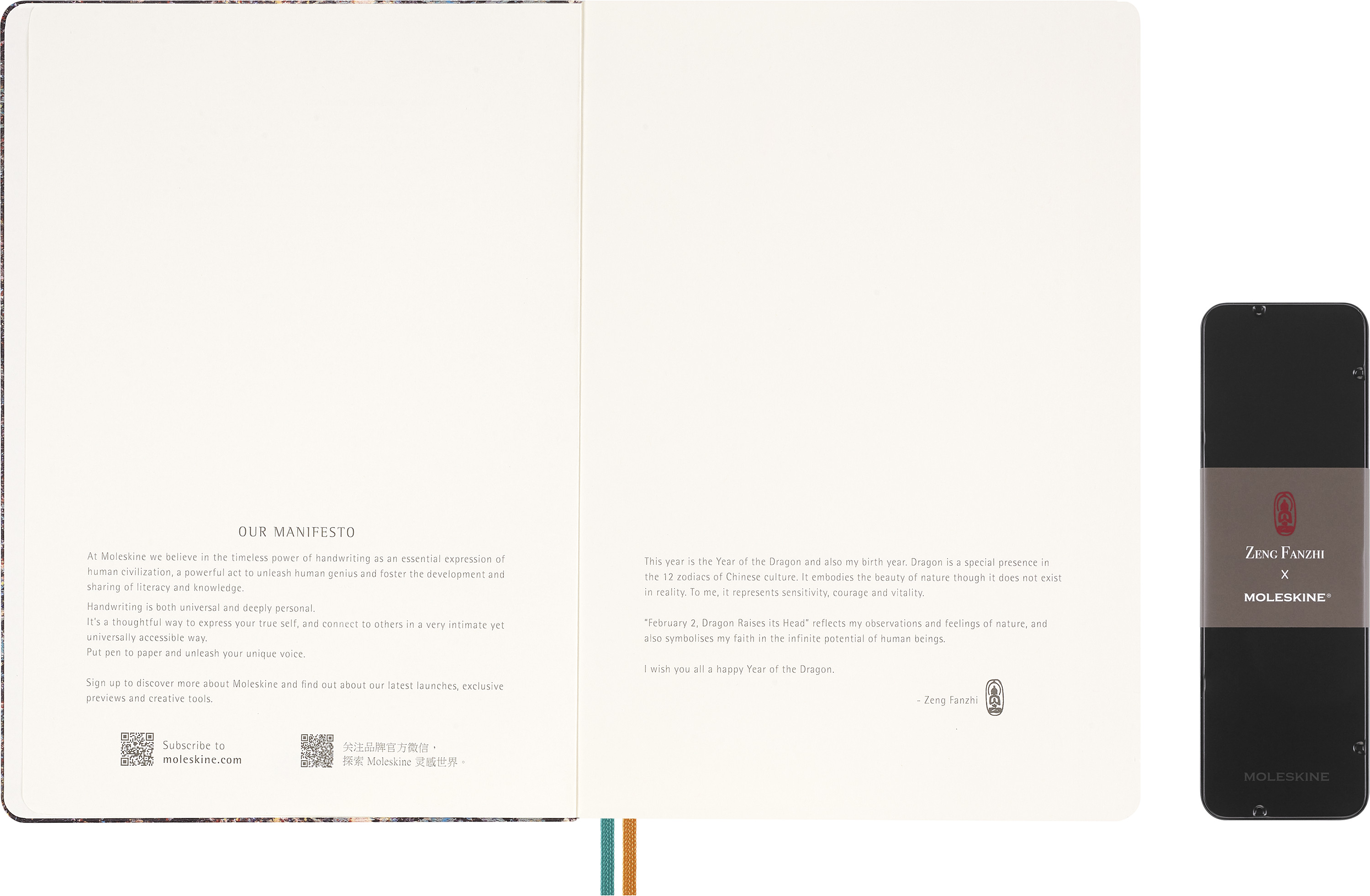 Ce remarquable coffret cadeau renferme un carnet de croquis de format A4. Réalisée en tissu agréable au toucher, la couverture du carnet de croquis présente le détail d'une peinture originale créée par Zeng Fanzhi à l'occasion de l'année du dragon. Les pages du carnet de croquis sont fabriquées à partir d'un papier de 165 g/m² qui constitue la base idéale pour une vaste gamme de supports artistiques et qui résiste également au gommage. Outre la couverture inspirée du Nouvel An chinois, cette édition limitée est également accompagnée d'une carte d'histoire et d'enveloppes porte-bonheur.