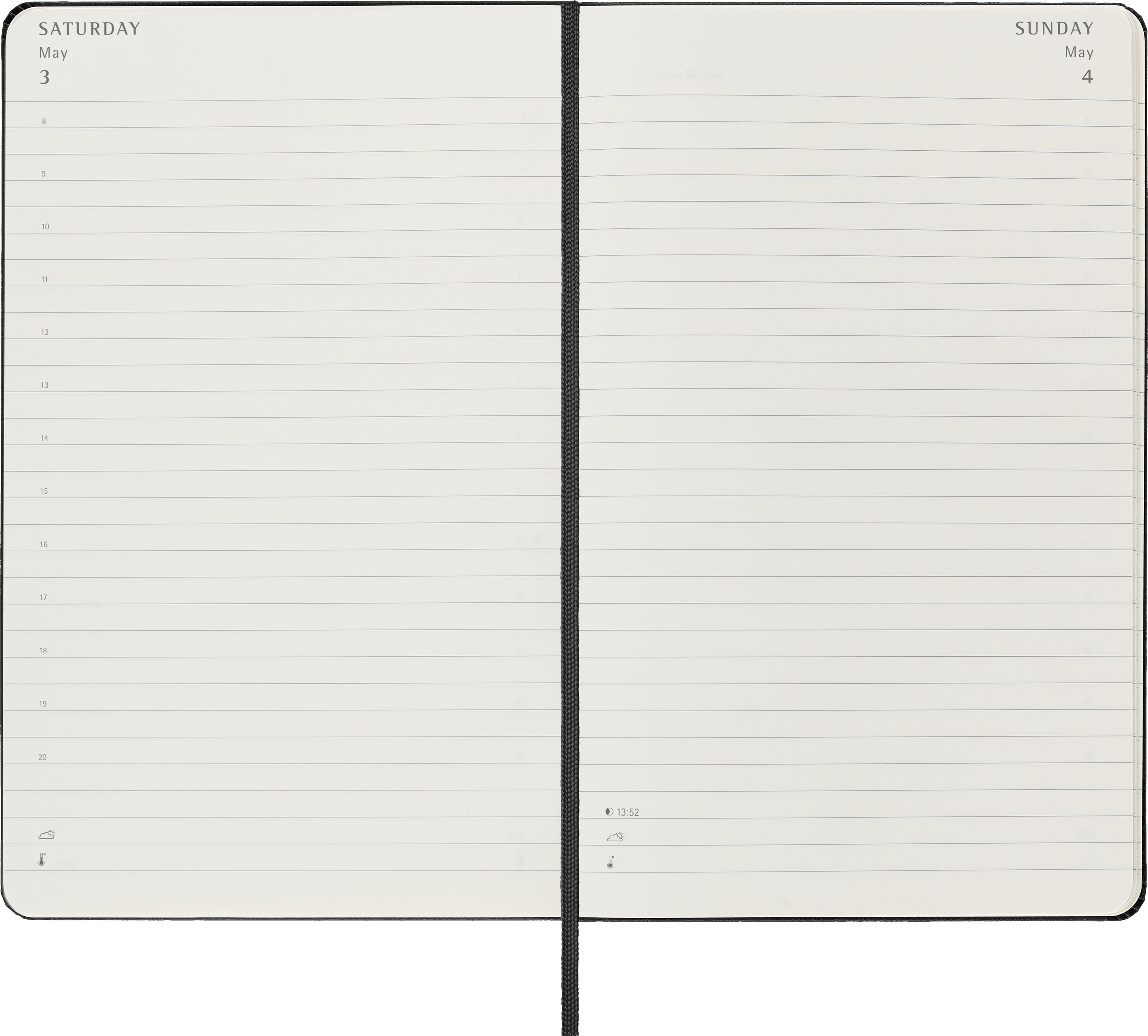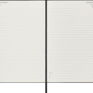 - fester Einband mit abgerundeten Ecken, Gummiband zum Verschliessen und Lesebändchen