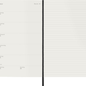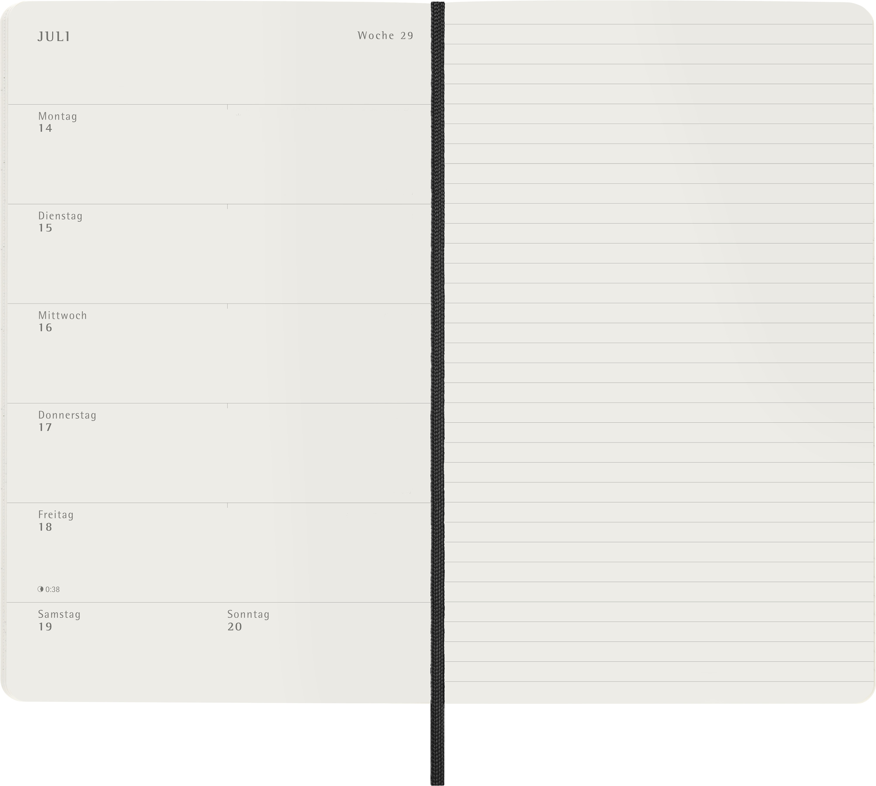 - weicher Einband mit abgerundeten Ecken, Gummiband zum Verschliessen und Lesebändchen