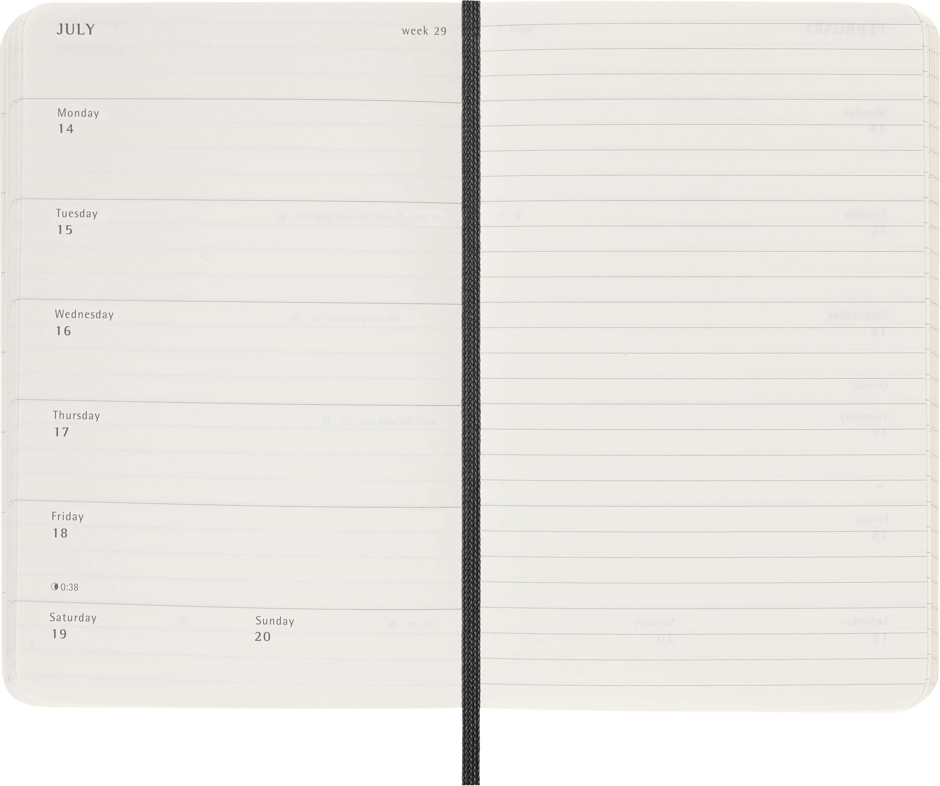 - weicher Einband mit abgerundeten Ecken, Gummiband zum Verschliessen und Lesebändchen