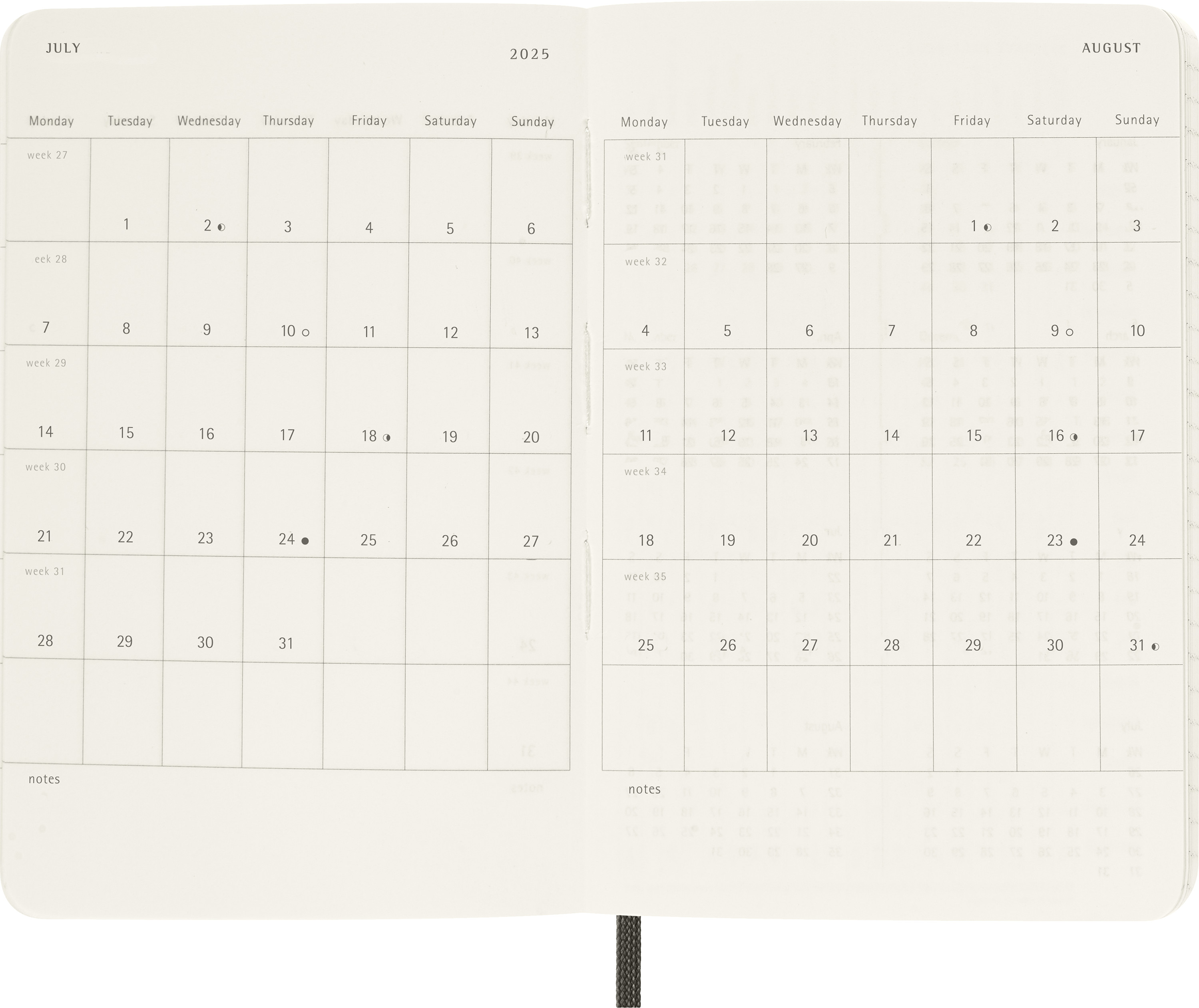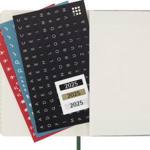 - weicher Einband mit abgerundeten Ecken, Gummiband zum Verschliessen und Lesebändchen