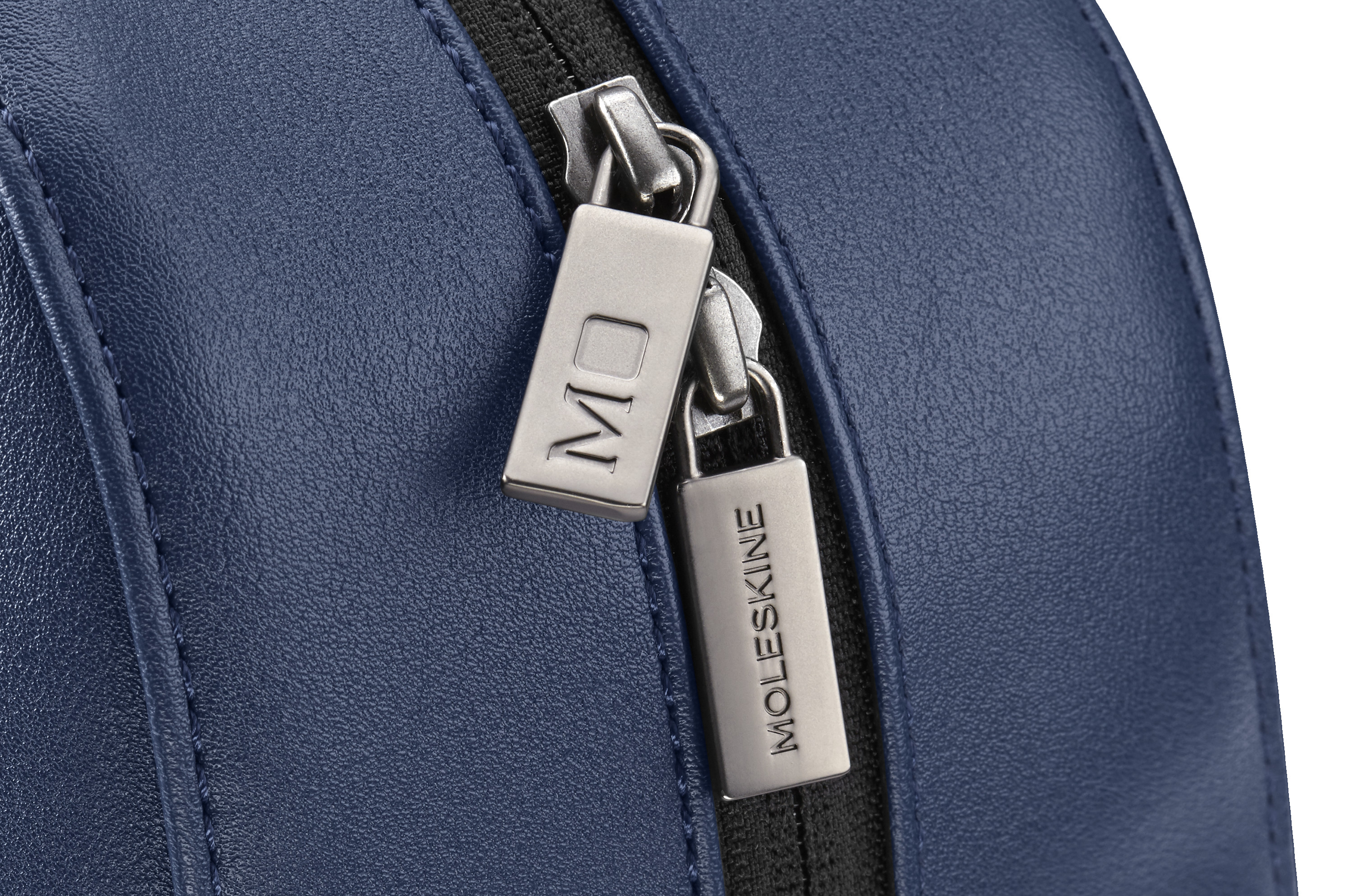 - Reissverschlüsse mit mattem Gunmetal-Finish und eingraviertem Moleskine Logo sowie geprägtem Monogramm auf der Vorderseite
