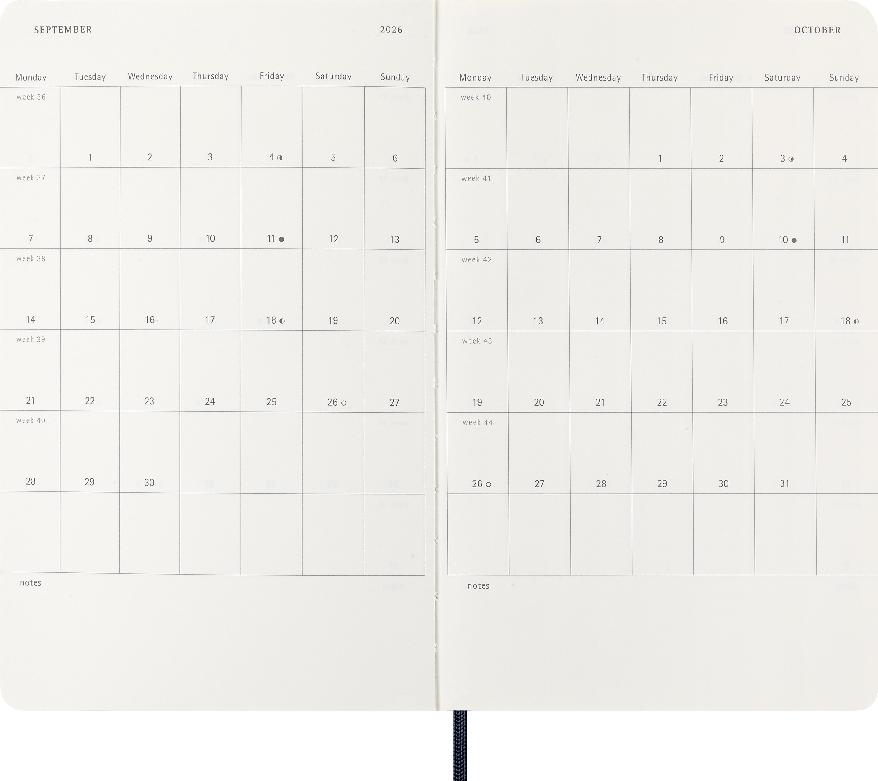 - weicher Einband mit abgerundeten Ecken, Gummiband zum Verschliessen und Lesebändchen