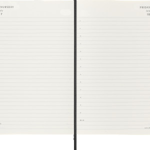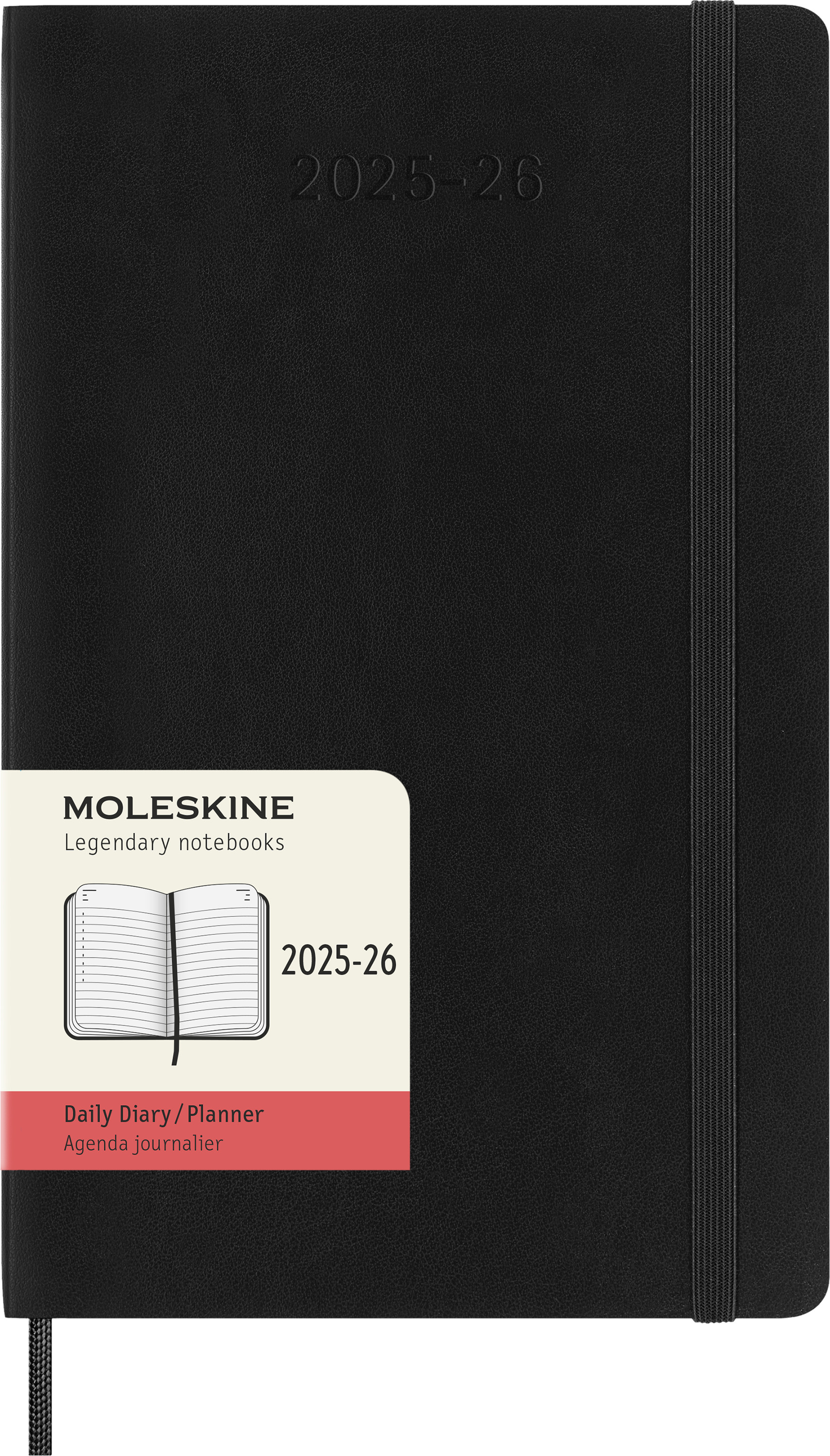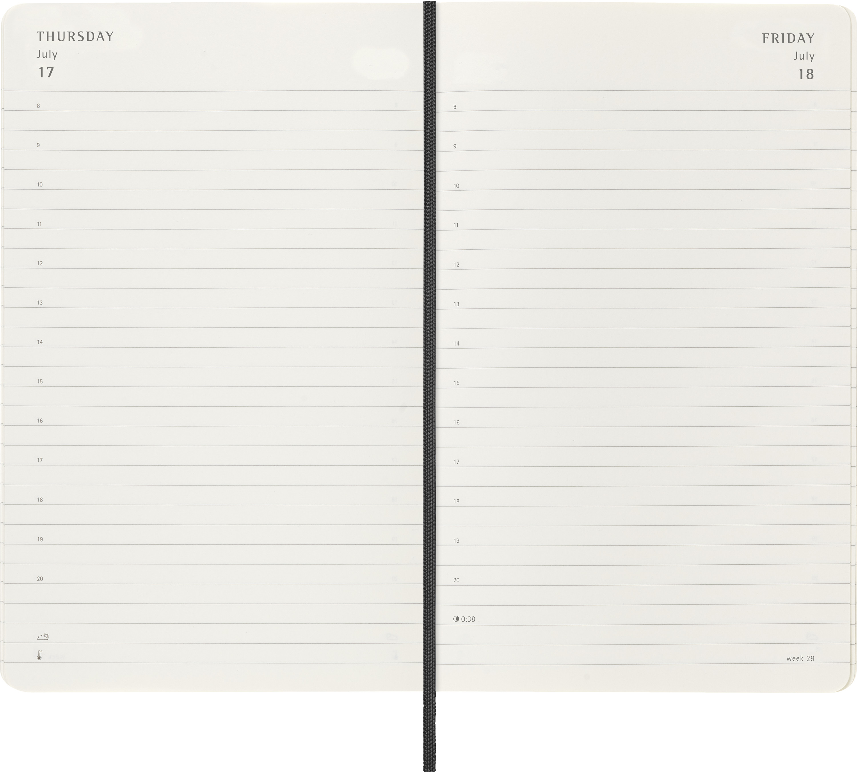 - weicher Einband mit abgerundeten Ecken, Gummiband zum Verschliessen und Lesezeichenbändchen