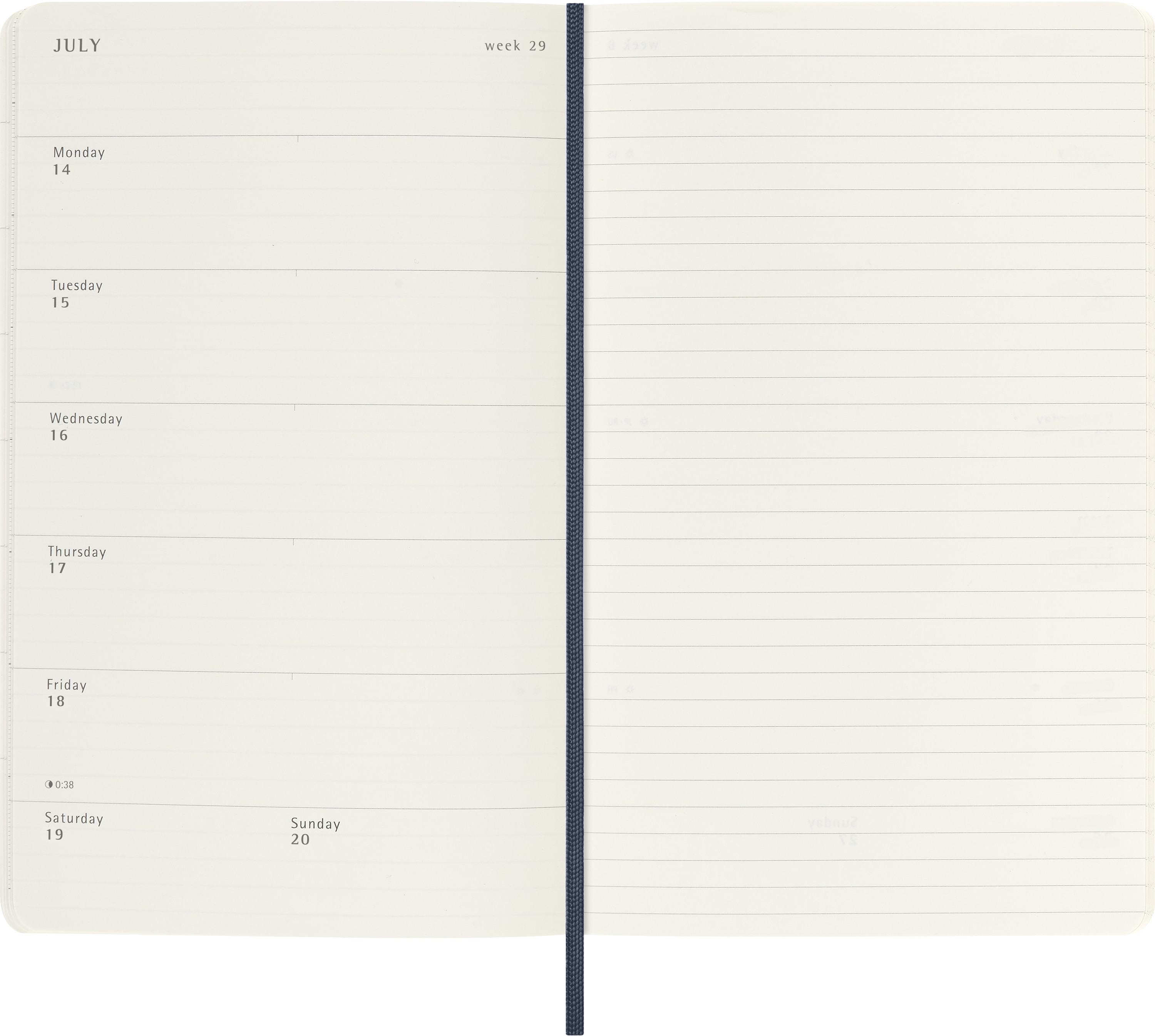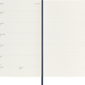 - Auf der linken Seite alle Termine der Woche auf einen Blick, linierte Seiten für Notizen und Ideen auf der rechten Seite