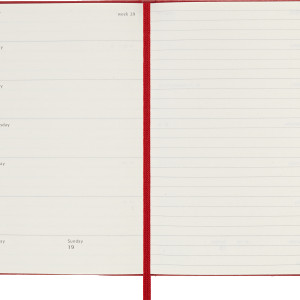 - Auf der linken Seite alle Termine der Woche auf einen Blick, linierte Seiten für Notizen und Ideen auf der rechten Seite