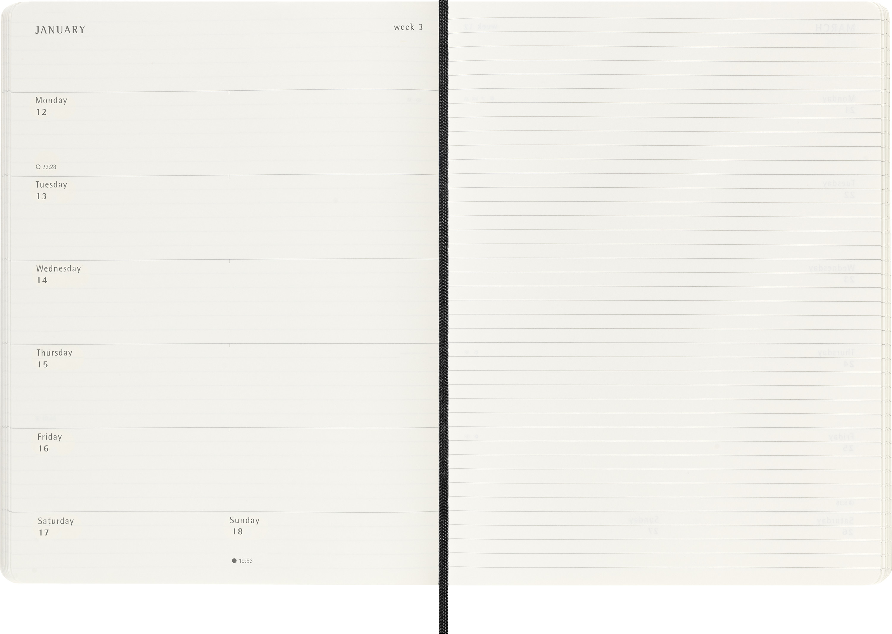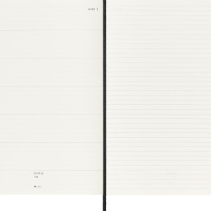- Auf der linken Seite alle Termine der Woche auf einen Blick, linierte Seiten für Notizen und Ideen auf der rechten Seite