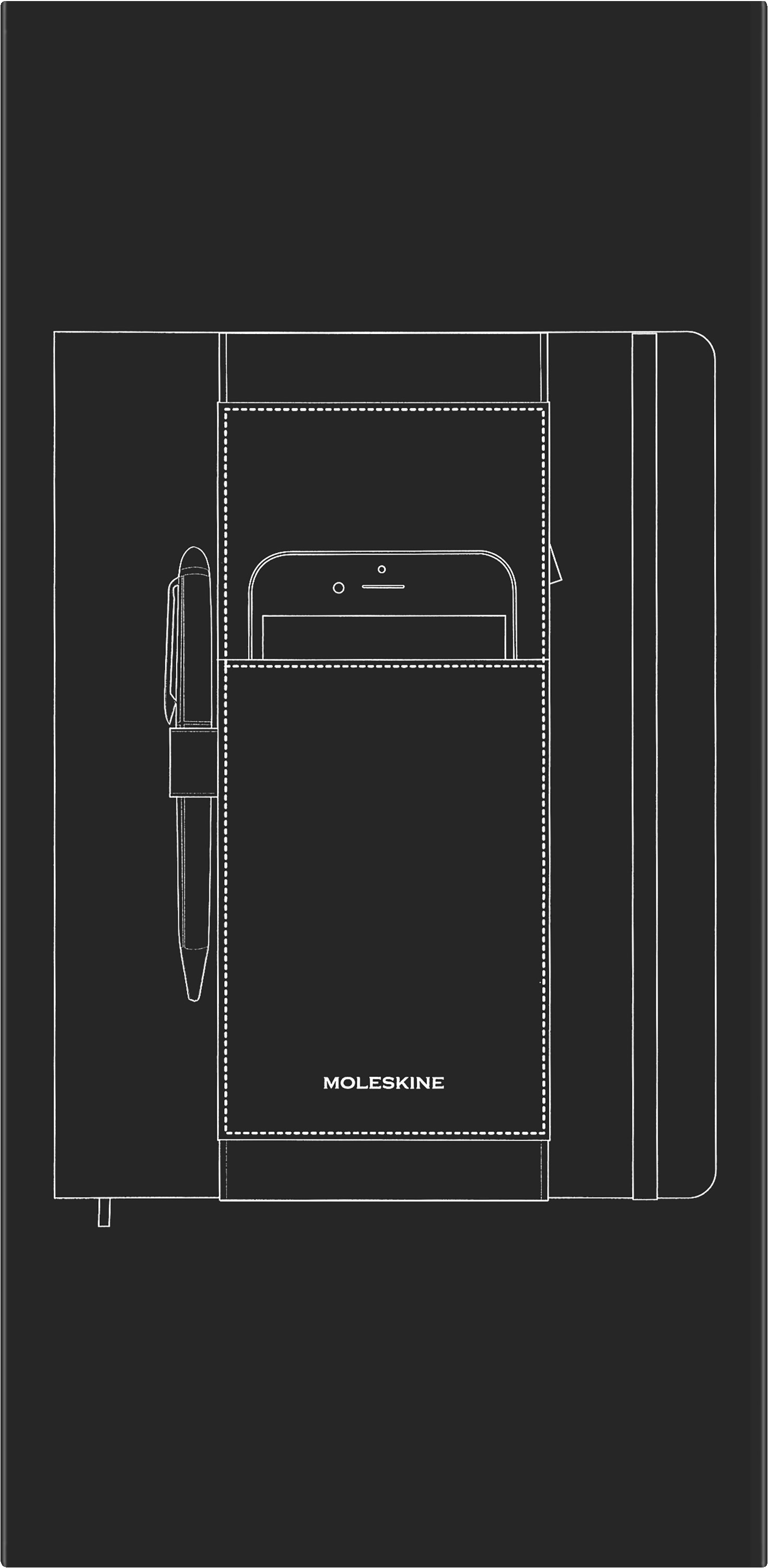 Dieses schwarze XL-Utensilienband wurde von Handwerkern, Architekten und Strassenkünstlern inspiriert, die ihre Werkzeuge an der Hüfte tragen, und ist ein praktisches Extra für Ihr Notizbuch, damit Sie alles stets zur Hand haben, was Sie für Ihre Notizen brauchen. Es passt auf jedes Moleskine XL-Notizbuch mit festem Einband und ist mit 2 Taschen ausgestattet, in denen Sie ein Smartphone, USB-Kabel und andere Utensilien aufbewahren können, die Sie im Alltag brauchen. Eine elastische Stiftschlaufe vervollständigt das Design, so dass Sie stets das richtige Schreibgerät griffbereit haben, um bei der Arbeit, zu Hause oder unterwegs Gedanken niederzuschreiben.