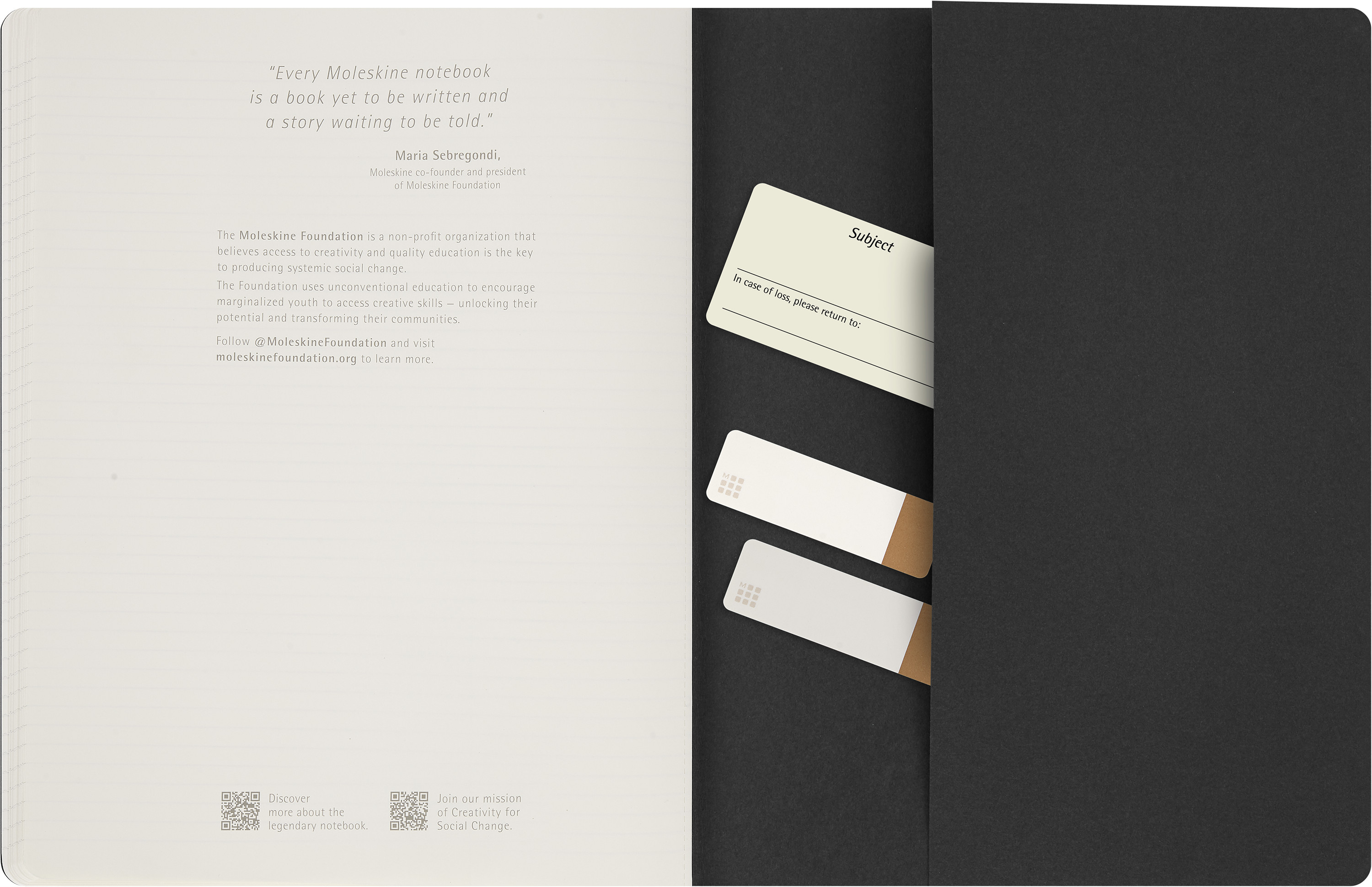 Das Student Cahier Notizheft im XXL Format enthält eine Reihe von Stickern, mit denen Sie Ihren Notizen eine weitere Ebene hinzufügen können, einschliesslich Lesezeichenstickern, um wichtige Seiten zu markieren. Die in verschiedenen Farben erhältlichen Student Cahiers können Sie mit einem Subject Sticker auf dem Cover kennzeichnen, der auch das sofort erkennbare „in case of loss“ Label von Moleskine enthält.