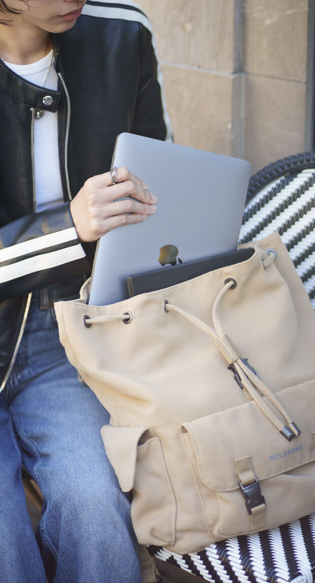 Entdecken Sie einen Rolltop Rucksack, der zu Ihrem Leben passt, wohin es Sie auch führt. Er wurde in Anlehnung an die Geschichte des legendären Notizbuchs entworfen und verfügt über Fächer für Moleskine Notizbücher und Kalender in den Grössen Pocket und Large sowie ein gepolstertes Gerätefach für Ihren Laptop und weitere Fächer und Taschen für Brille und Stift.