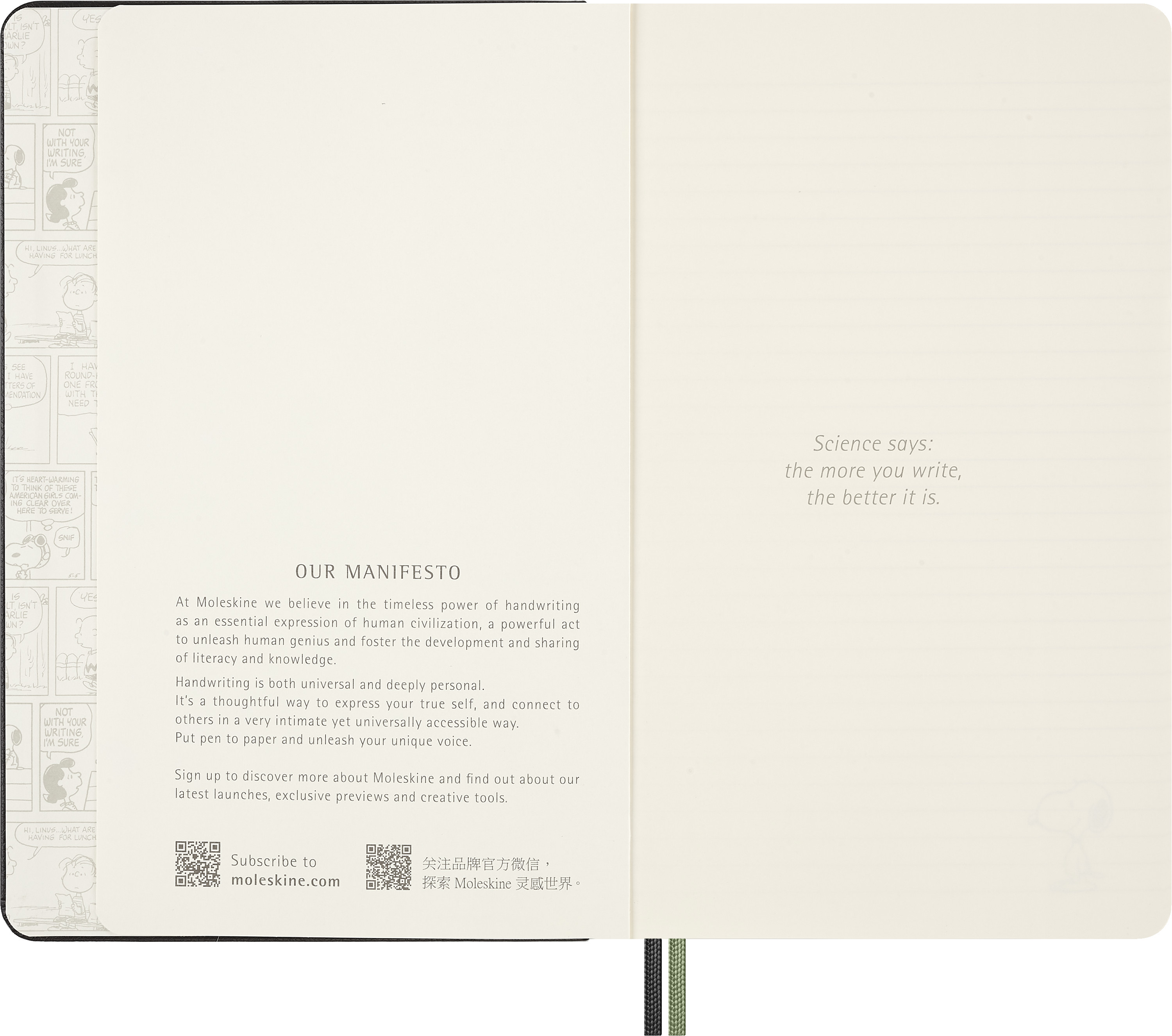 Halten Sie Ihre Gedanken, Ideen und Kritzeleien in diesem Peanuts Moleskine Notizbuch fest – eine Hommage an die einfachen Wahrheiten und die Kraft der Schreibens von Hand. Das linierte Notizbuch in der Grösse Large (13x21cm) zeigt kultige Peanuts Illustrationen und ein Zitat, das die Freude am Notieren und die Kunst des Schreibens hervorhebt.