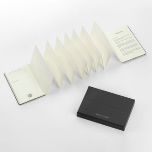 Im Inneren bieten zwei erweiterbare Fächer Platz für bis zu 24 Visitenkarten. Der gefaltete Einsatz besteht aus 14 Seiten im Leporello-Stil – ein diskreter Raum für schnelle Notizen, Ideen oder Gedanken während einer beruflichen Begegnung.