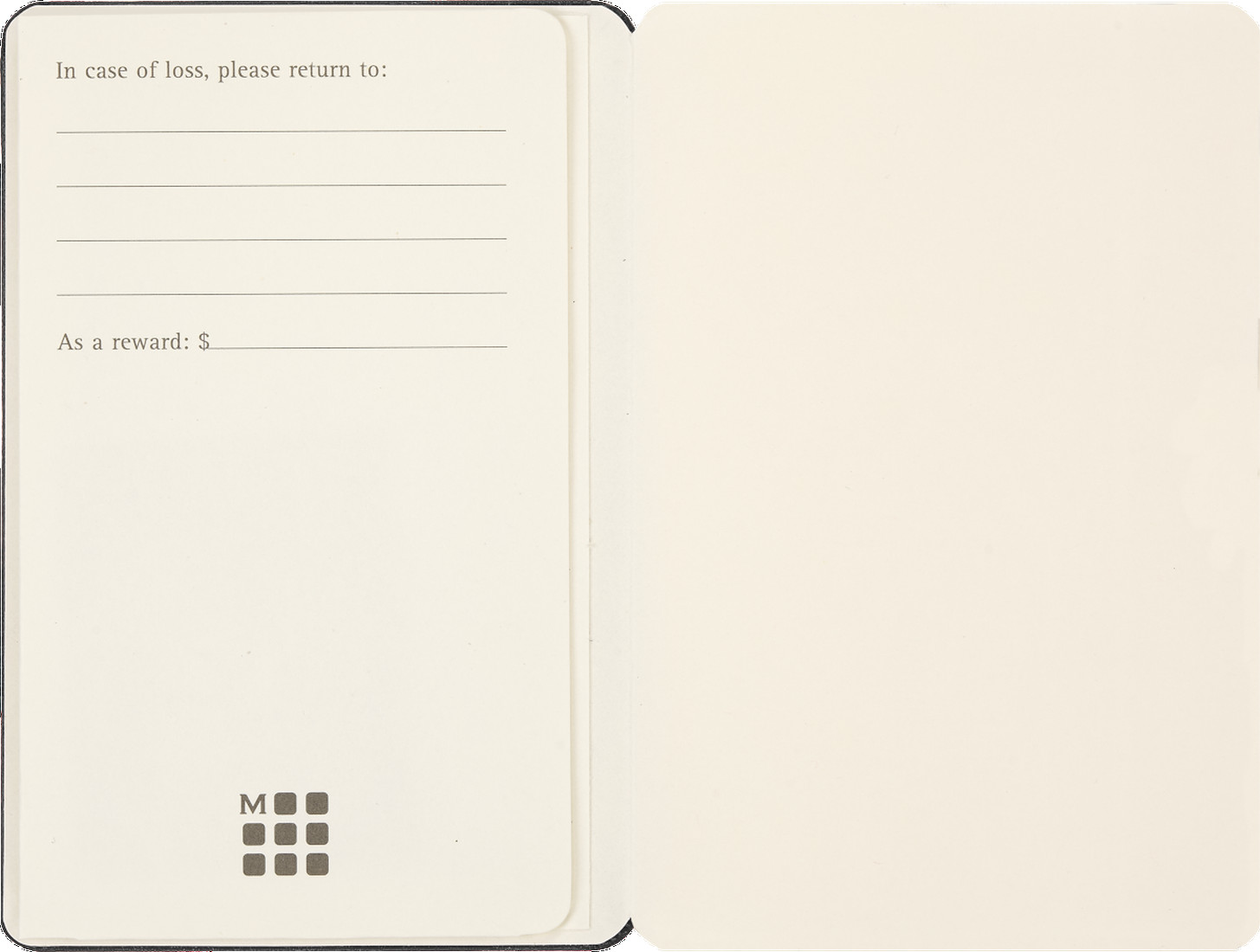 - Vorsatzblatt mit „in case of loss“ Label