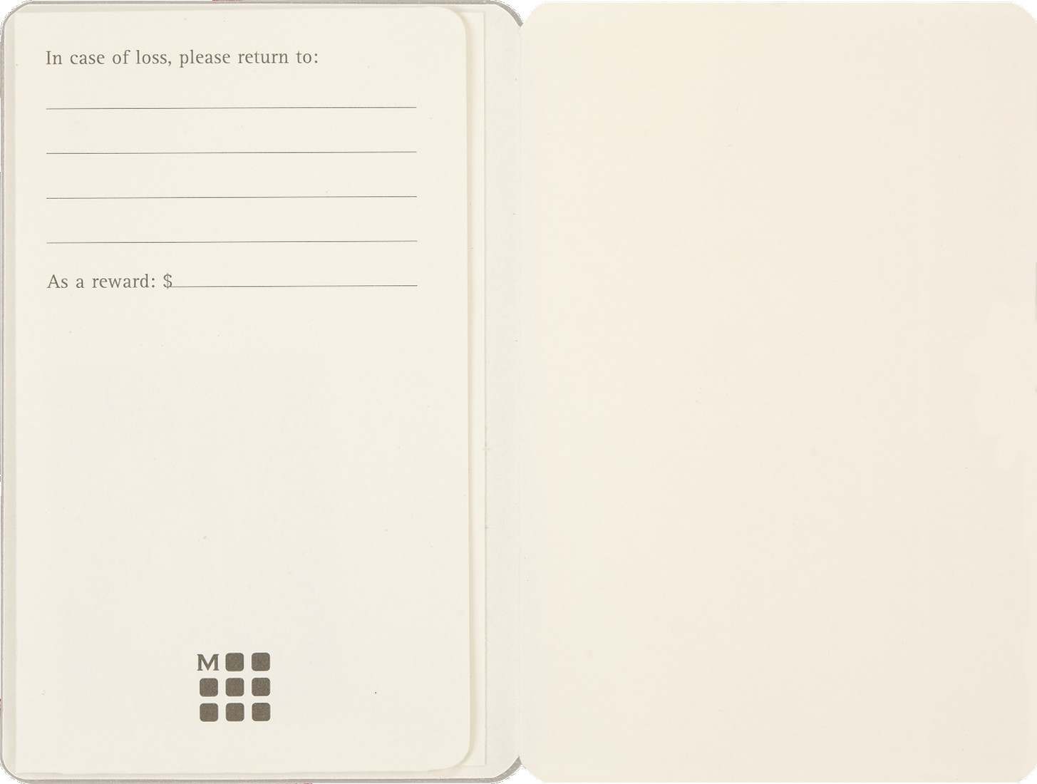 - Vorsatzblatt mit „in case of loss“ Label