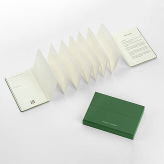 Die klare und durchdachte Struktur ist inspiriert vom fließenden Format traditioneller japanischer Emakimono-Rollen und ideal, um Kontakte und die Geschichten hinter jedem Treffen festzuhalten. Die farblich abgestimmte Box dient zugleich der Aufbewahrung von persönlichen Erinnerungsstücken und kann mit einem Gummiband am Etui befestigt werden.