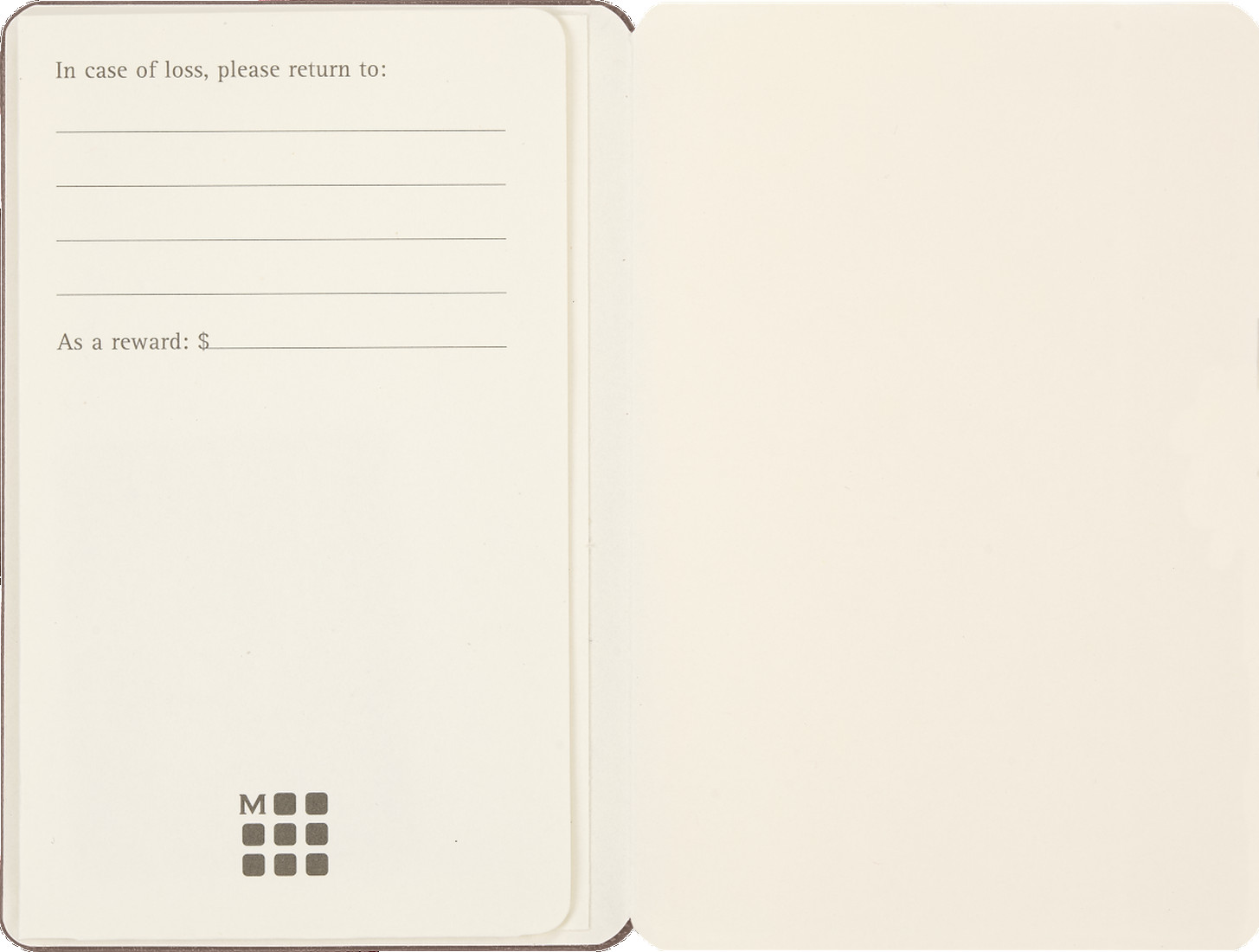 - Vorsatzblatt mit „in case of loss“ Label