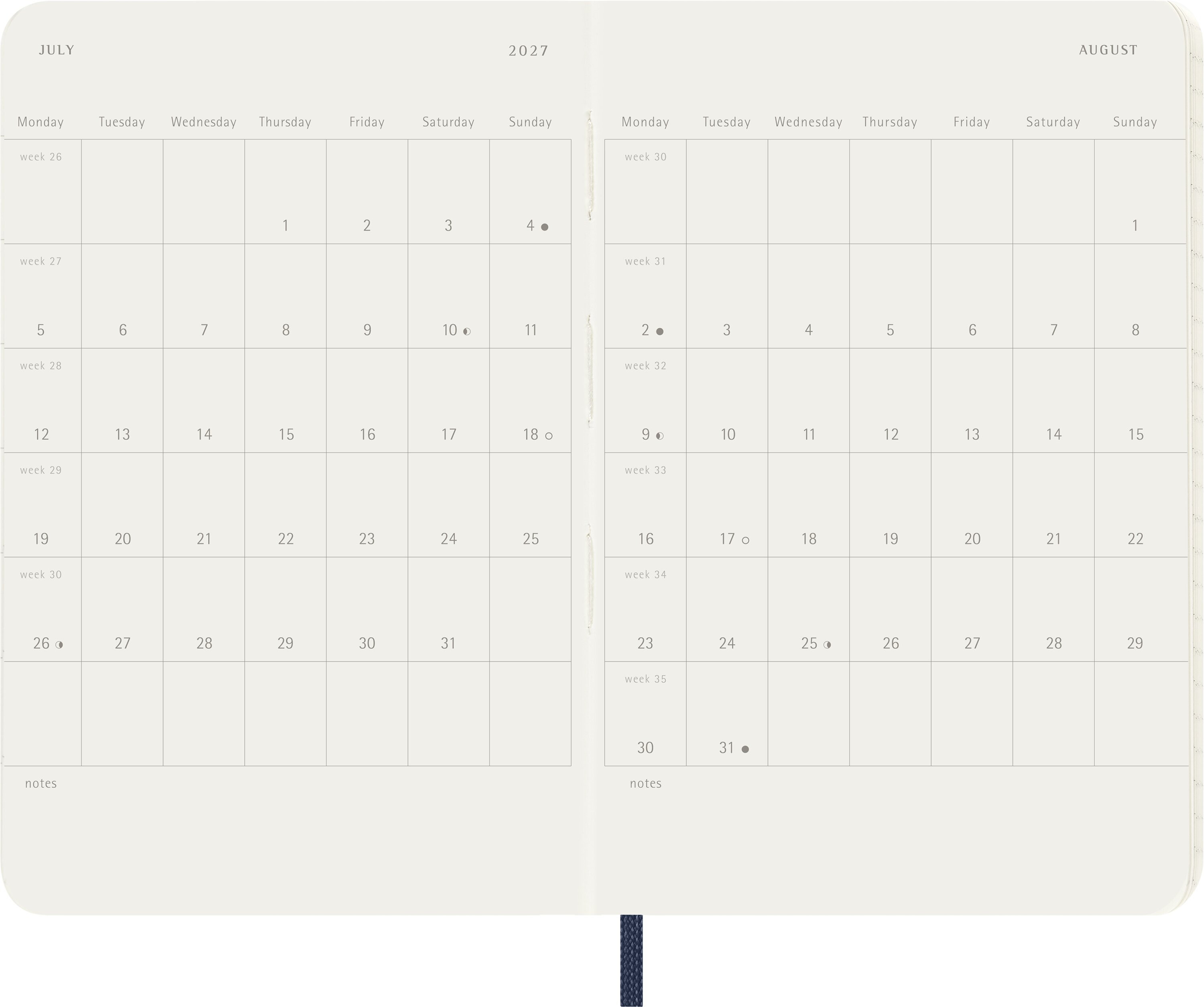 - weicher Einband mit abgerundeten Ecken, Gummiband zum Verschliessen und Lesezeichenbändchen