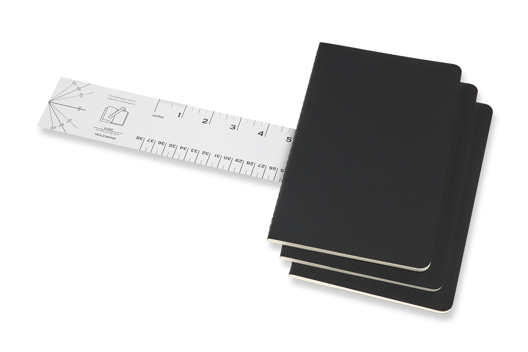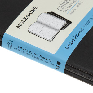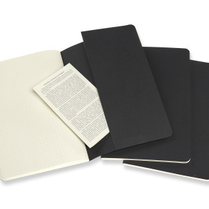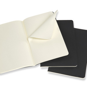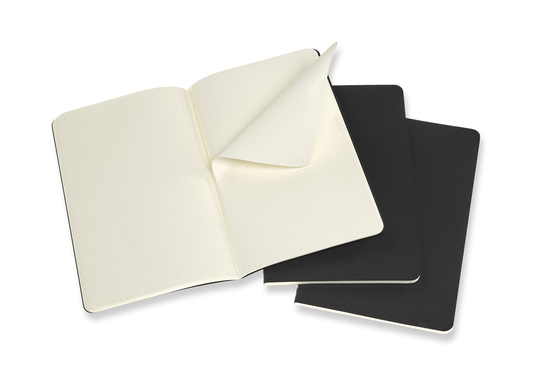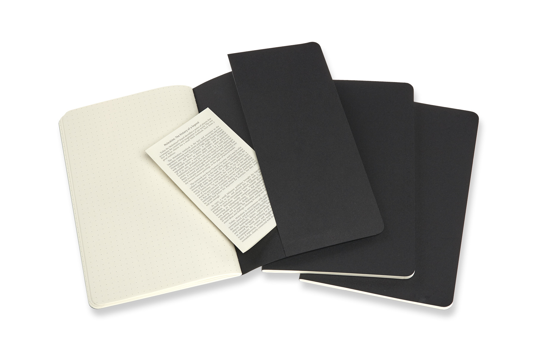 Die Notizhefte haben einen stabilen Einband aus schwarzem Karton mit sichtbarer Fadenheftung. Die letzten 16 Seiten sind heraustrennbar, mit einer grossen Innentasche für lose Zettel und einem Text zur Geschichte von Moleskine. Gepunktetes, chlorfrei gebleichtes Papier. 3er-Set