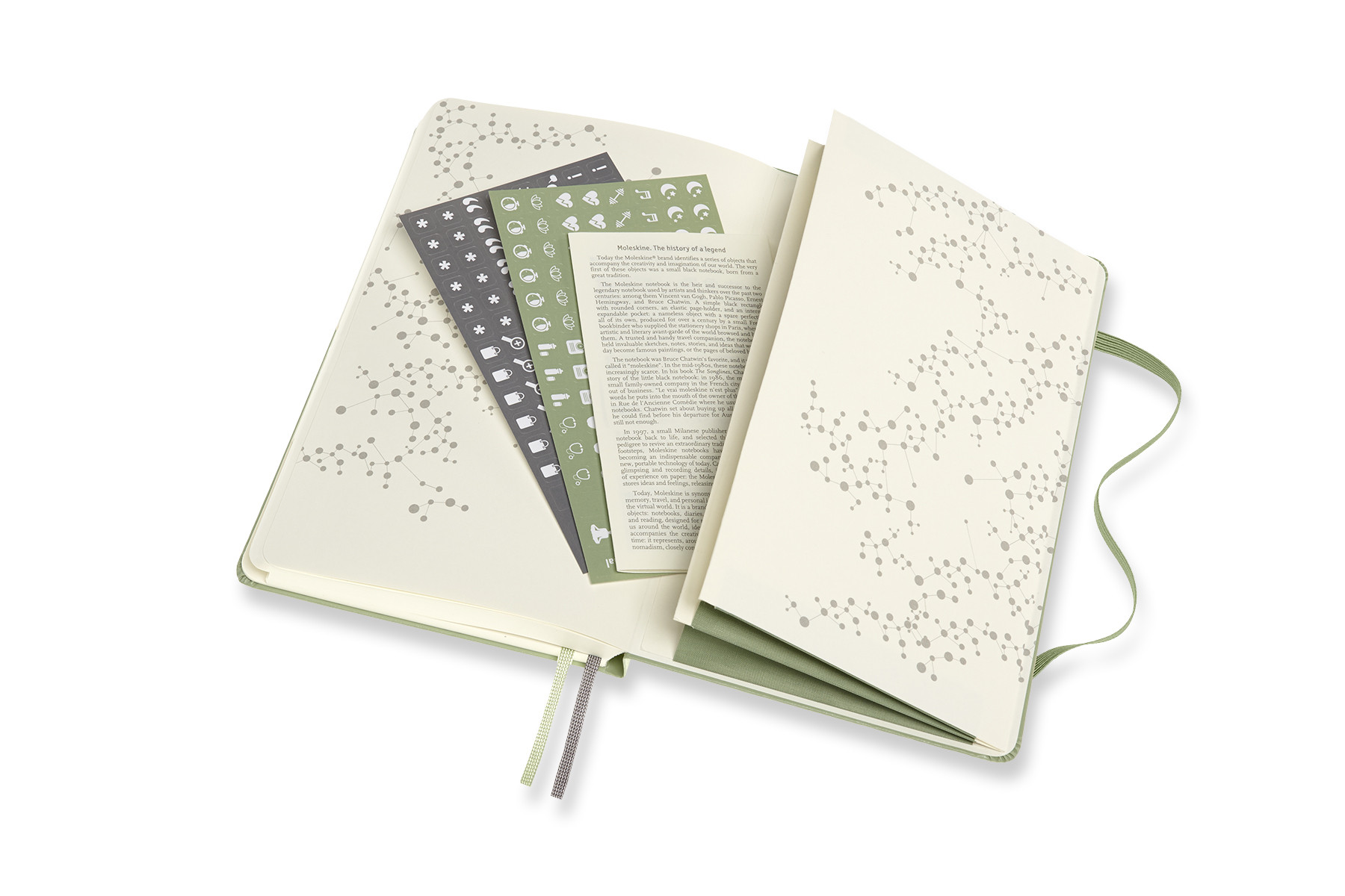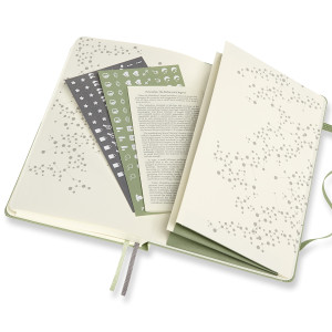 - fester Einband mit themenspezifischer Prägung, abgerundete Ecken, Gummiband zum Verschliessen