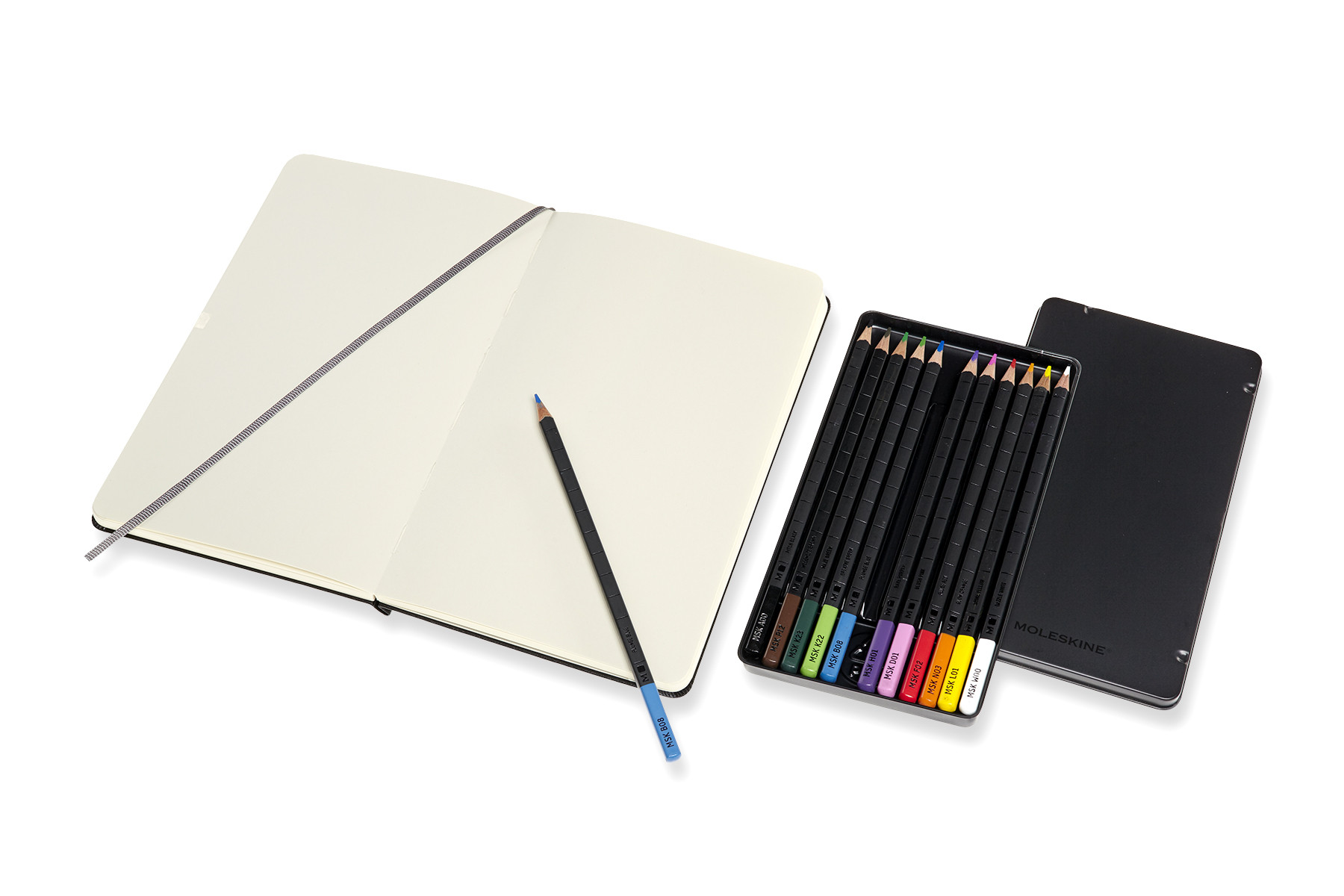 Set besteht aus einem Classic Large (13 x 21 cm) Sketch mit 104 Seitem und 165g/m2 Papier und einem Stifte Set mit 12 Aquarellstiften: