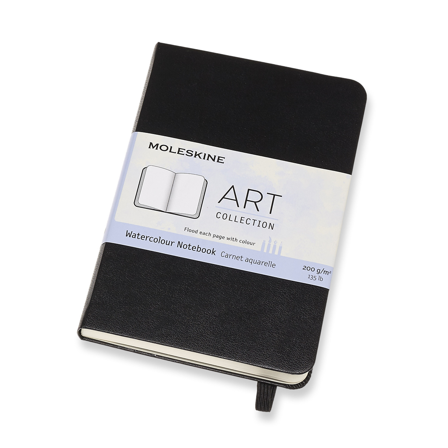 Wie die Classic Notizbücher mit festem Einband und abgerundeten Ecken gibt es neu dieses Watercolour Notebook mit einem Gummiband zum Verschliessen, einer Falttasche am hinteren Buchrücken, mit 200 g/m2 Aquarellpapier (kaltgepresst, mit 25% Baumwollfaseranteil und säurefrei), Vorder- und Rückseite haben eine identische Papieroberfläche und ist besonders geeignet für Farben mit hohem Wasseranteil sowie den Moleskine Aquarellstiften.