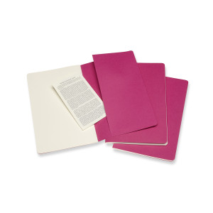 Die Notizhefte haben einen stabilen Einband aus pinkem Karton mit sichtbarer Fadenheftung. Die letzten 16 Seiten sind heraustrennbar, mit einer grossen Innentasche für lose Zettel und einem Text zur Geschichte von Moleskine. Blanko, chlorfrei gebleichtes Papier. 3er-Set