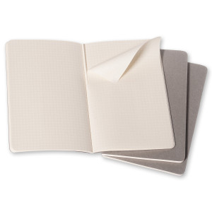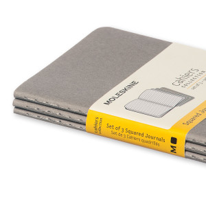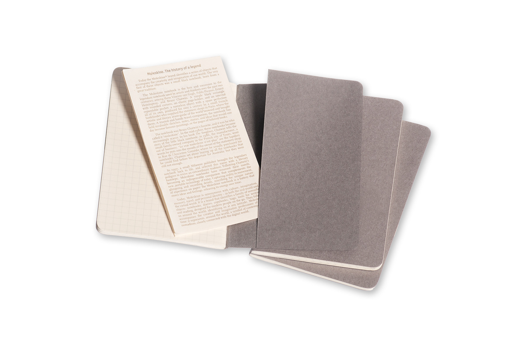 Kariertes Cahier- Notizheft. 3-er Set. Kartoneinband mit sichtbarer Fadenheftung am Rücken. Die letzten 16 Seiten sind heraustrennbar. Mit grosser Innentasche für lose Notizzettel.