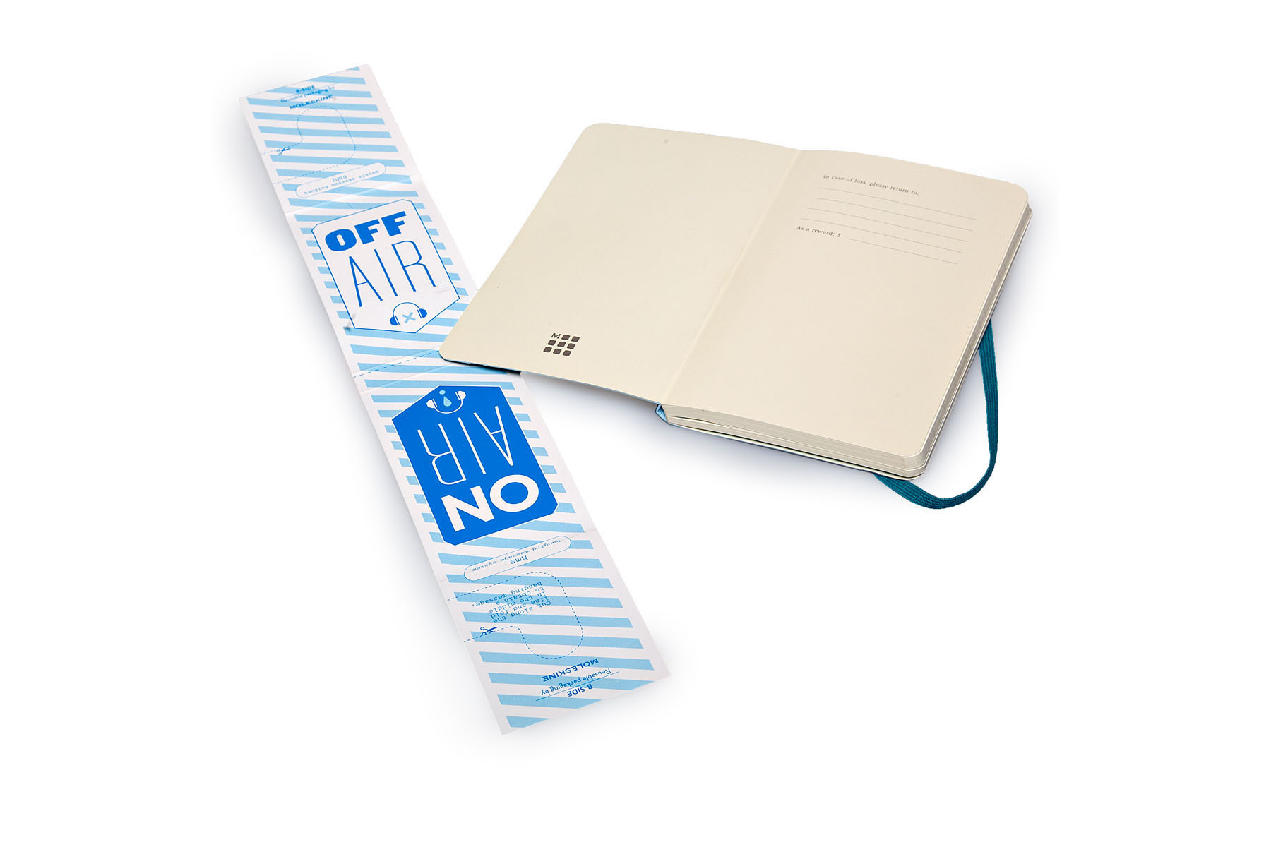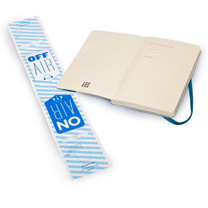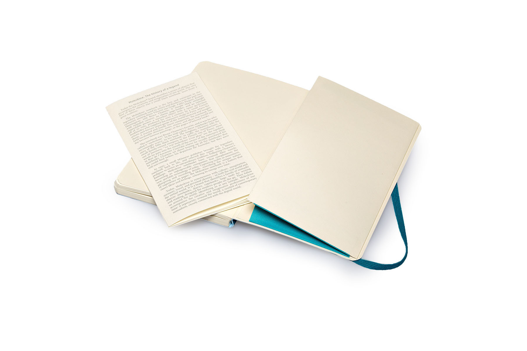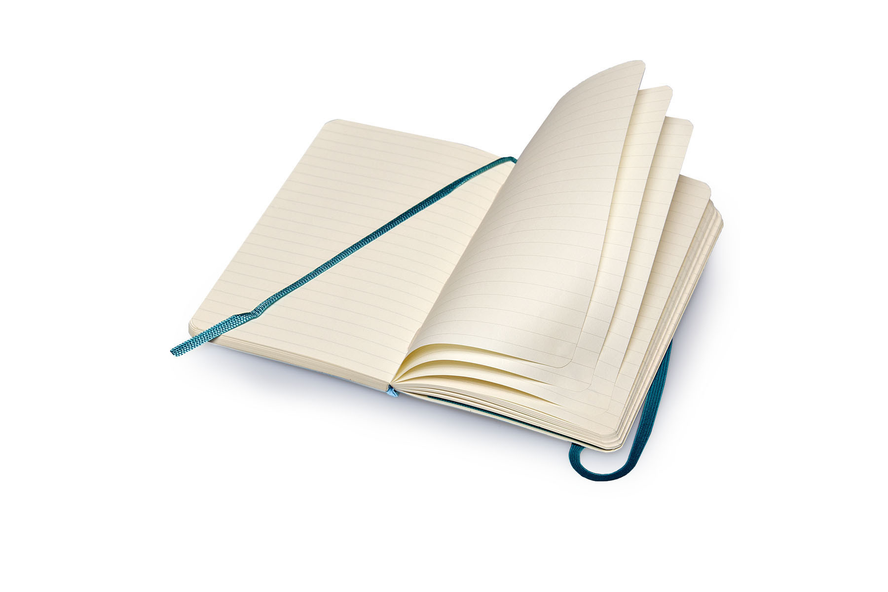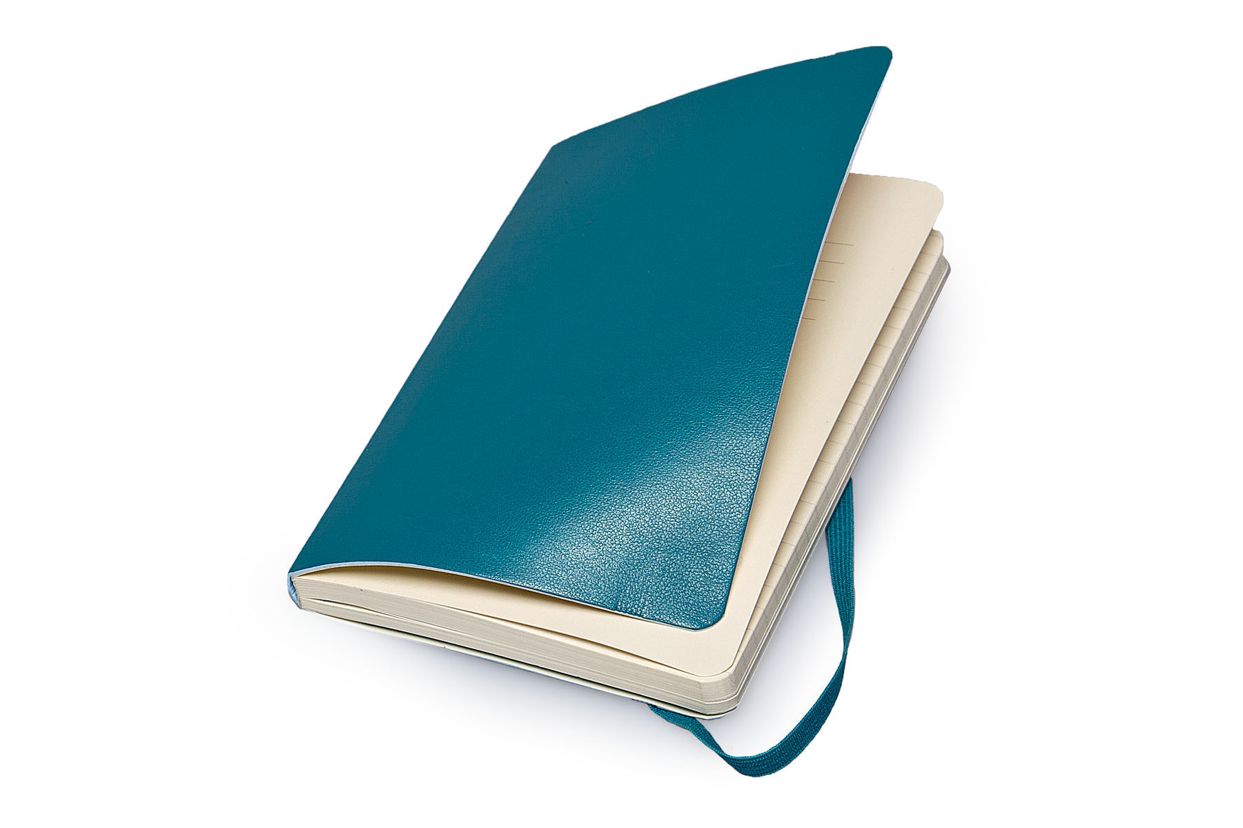 Notizbuch mit weichem Einband und linierten Seiten. Inklusive Gummiband, Lesezeichen und integrierter Falttasche in der Einbandfarbe.