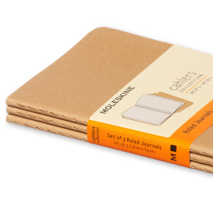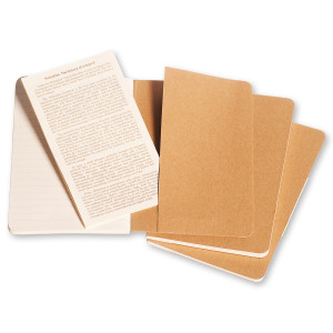 Die Notizhefte haben einen stabilen Einband aus packpapierfarbenem Karton mit sichtbarer Fadenheftung. Die letzten 16 Seiten sind heraustrennbar, mit einer grossen Innentasche für lose Zettel und einem Text zur Geschichte von Moleskine. Liniertes, chlorfrei gebleichtes Papier. 3er-Set