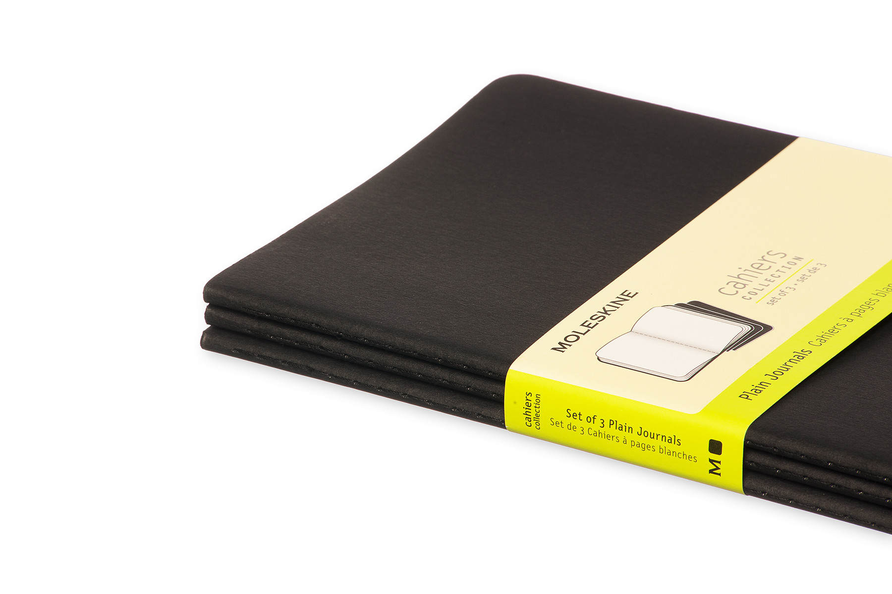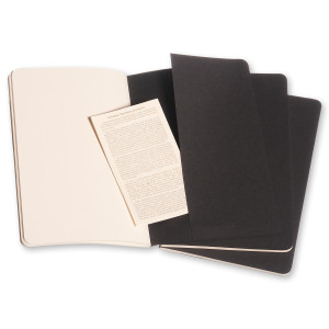 Die Notizhefte haben einen stabilen Einband aus schwarzem Karton mit sichtbarer Fadenheftung. Die letzten 16 Seiten sind heraustrennbar, mit einer grossen Innentasche für lose Zettel und einem Text zur Geschichte von Moleskine. Blanko, chlorfrei gebleichtes Papier. 3er-Set