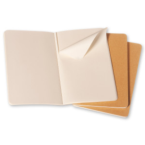 Die Notizhefte haben einen stabilen Einband aus packpapierfarbenem Karton mit sichtbarer Fadenheftung. Die letzten 16 Seiten sind heraustrennbar, mit einer grossen Innentasche für lose Zettel und einem Text zur Geschichte von Moleskine. Blanko, chlorfrei gebleichtes Papier. 3er-Set