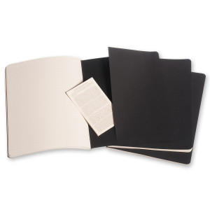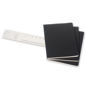 Die Notizhefte haben einen stabilen Einband aus schwarzem Karton mit sichtbarer Fadenheftung. Die letzten 16 Seiten sind heraustrennbar, mit einer grossen Innentasche für lose Zettel und einem Text zur Geschichte von Moleskine. Liniertes, chlorfrei gebleichtes Papier. 3er-Set