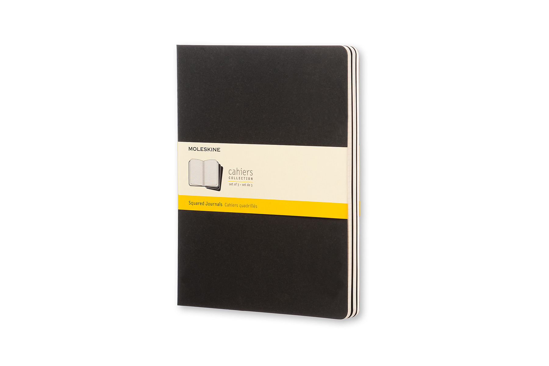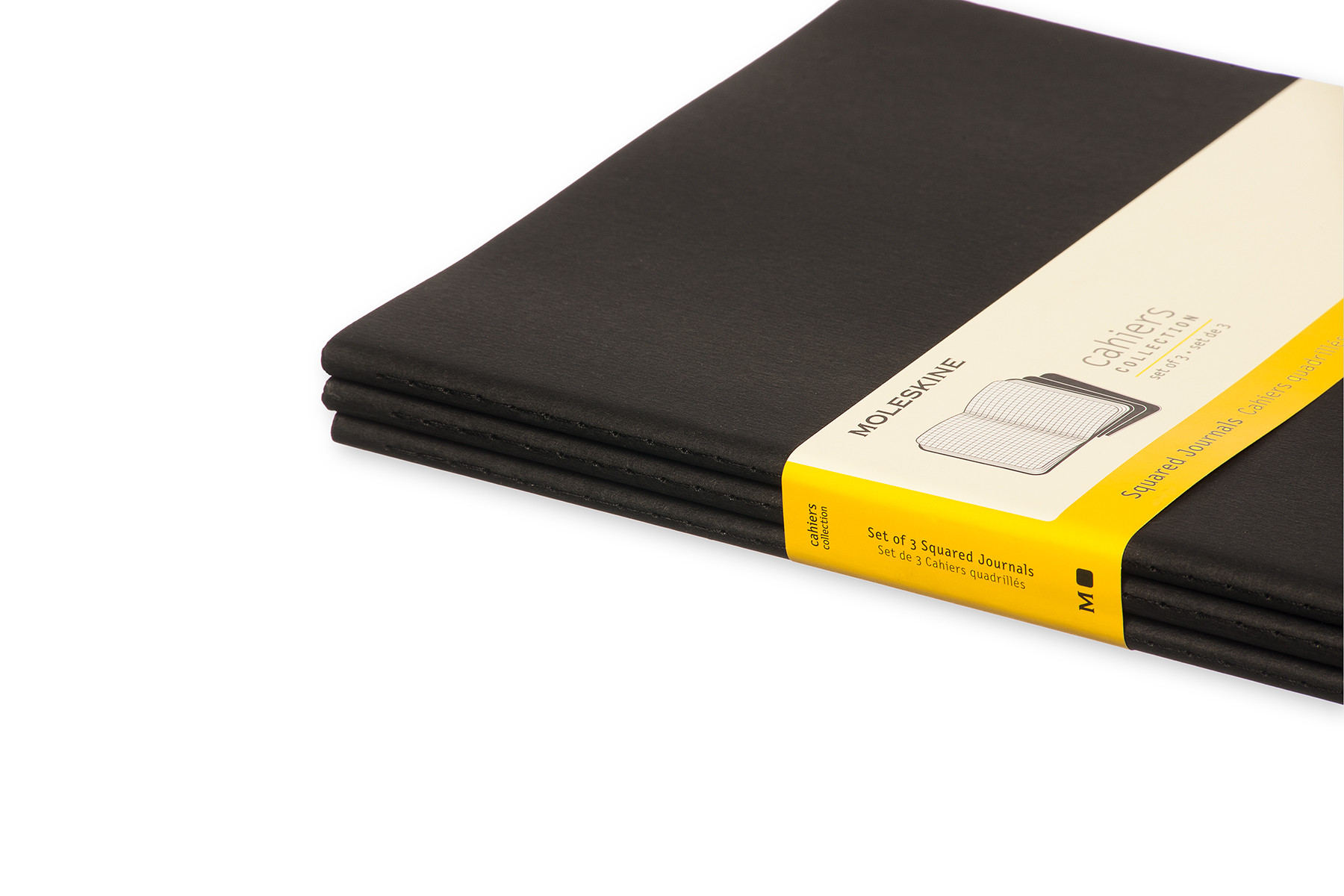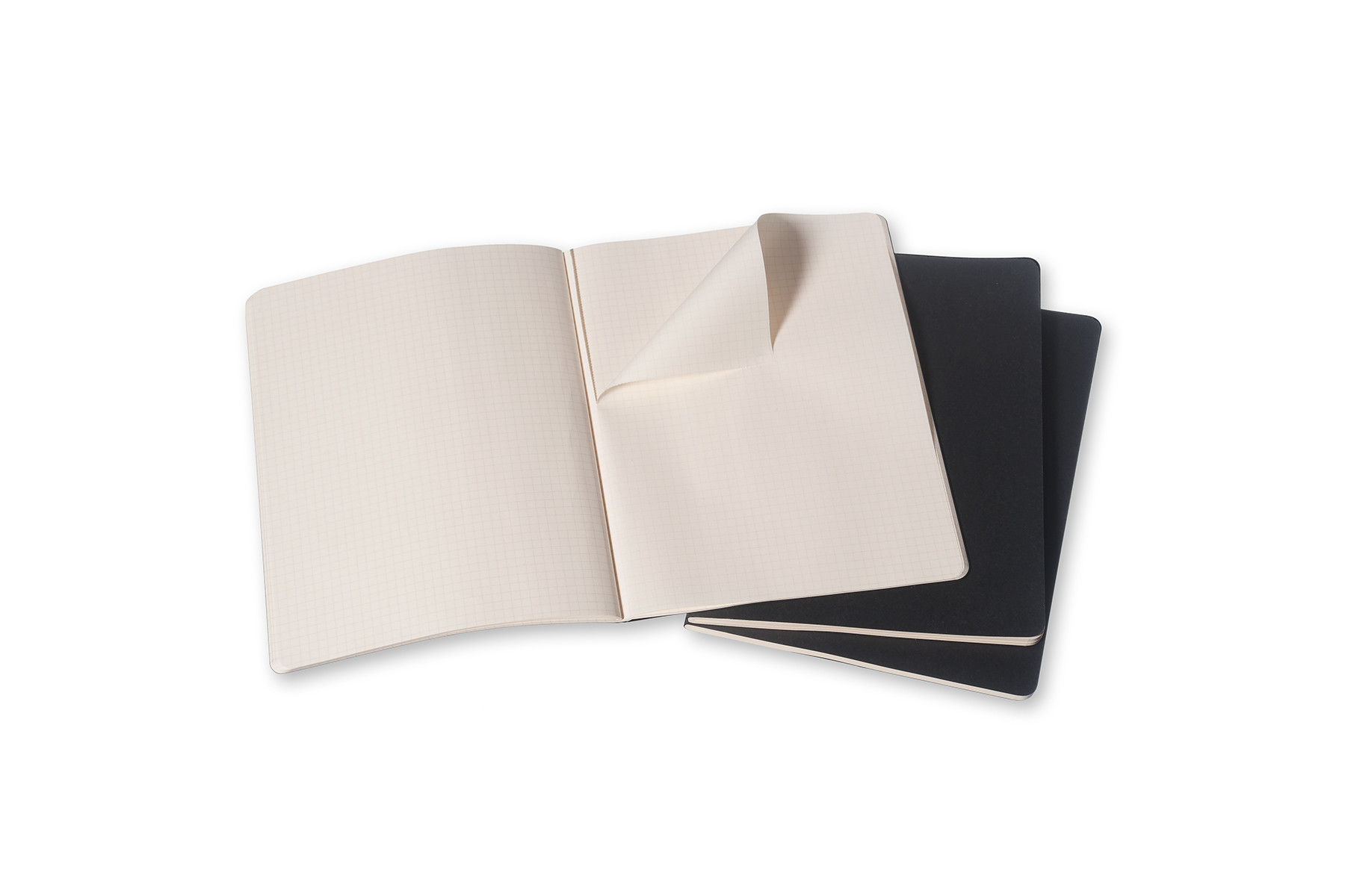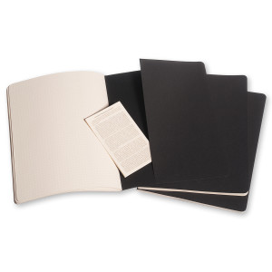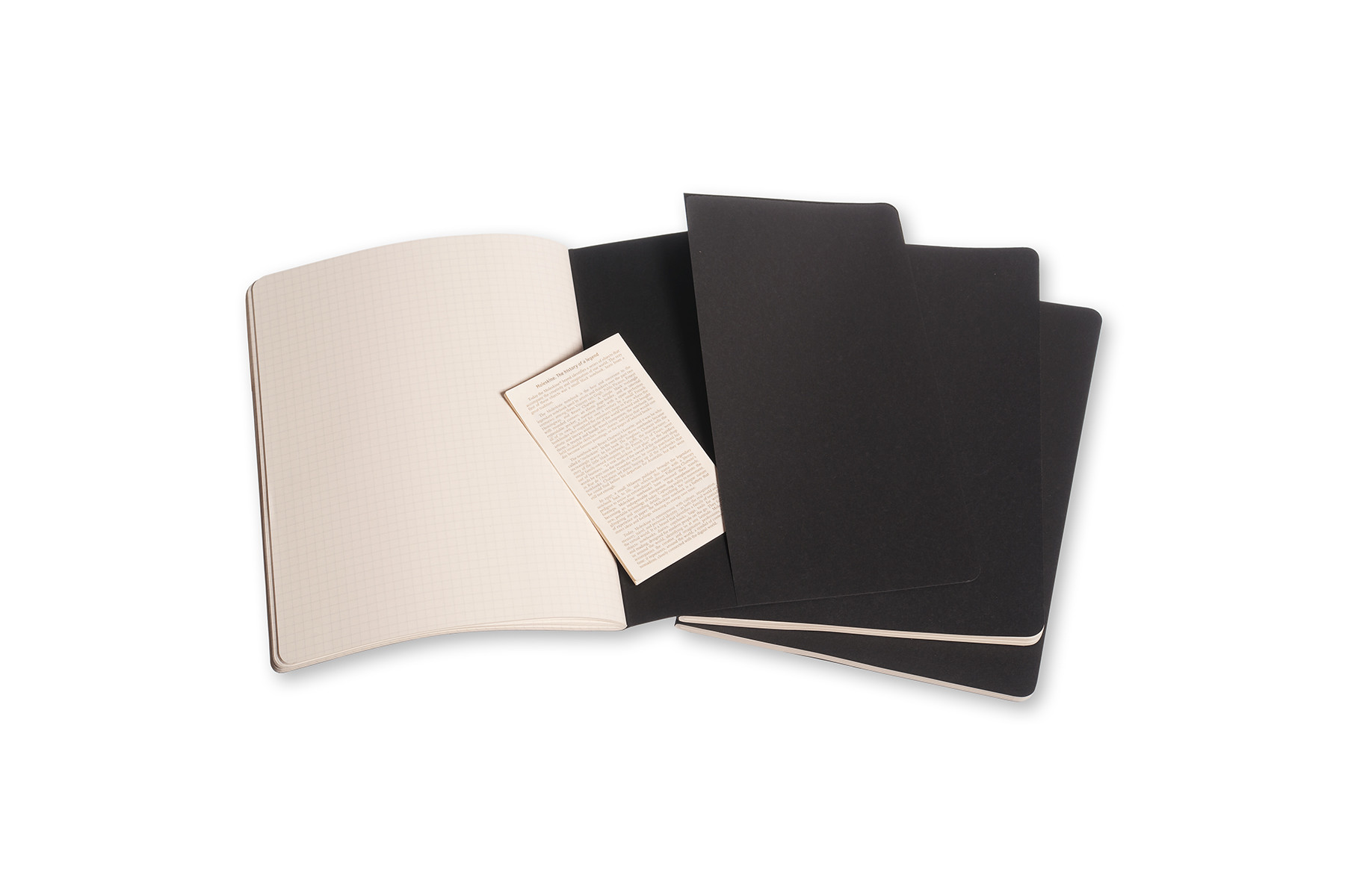 Die Notizhefte haben einen stabilen Einband aus schwarzem Karton mit sichtbarer Fadenheftung. Die letzten 16 Seiten sind heraustrennbar, mit einer grossen Innentasche für lose Zettel und einem Text zur Geschichte von Moleskine. Kariertes, chlorfrei gebleichtes Papier. 3er-Set
