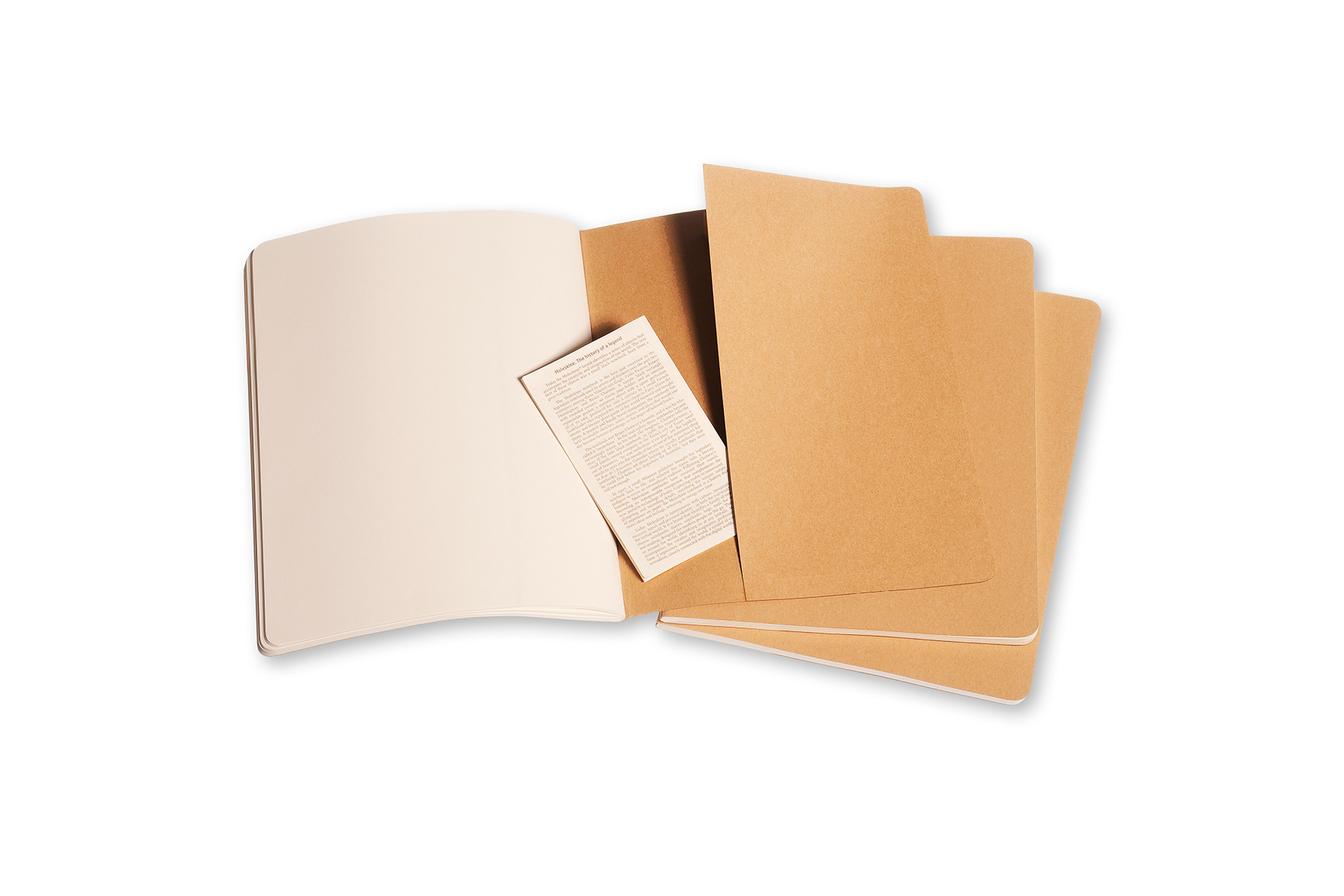 Die Notizhefte haben einen stabilen Einband aus packpapierfarbenem Karton mit sichtbarer Fadenheftung. Die letzten 16 Seiten sind heraustrennbar, mit einer grossen Innentasche für lose Zettel und einem Text zur Geschichte von Moleskine. Blanko, chlorfrei gebleichtes Papier. 3er-Set