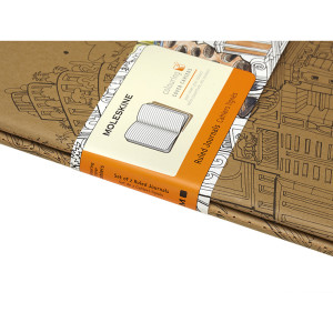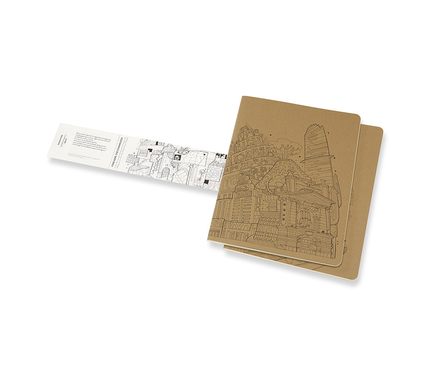 Die flexiblen Kartoneinbände des linierten Cahiers (2er Set) verfügen auf der Vorder- wie auch auf der Rückseite über komplexe Zeichnungen des Architekten, Illustrators und Reisenden Carlo Stanga zum selber Ausmalen.