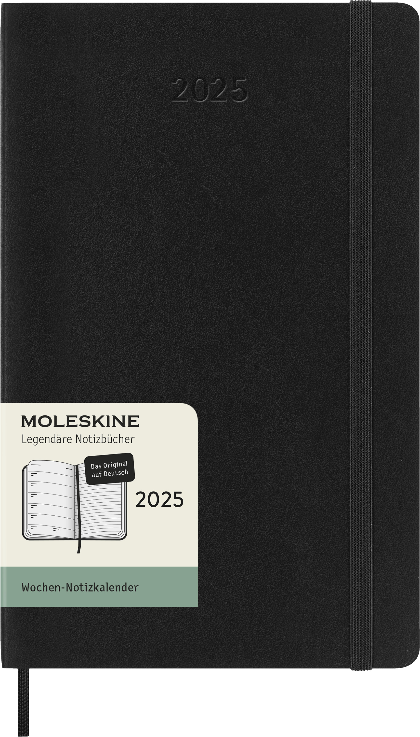 - weicher Einband mit abgerundeten Ecken, Gummiband zum Verschliessen und Lesebändchen