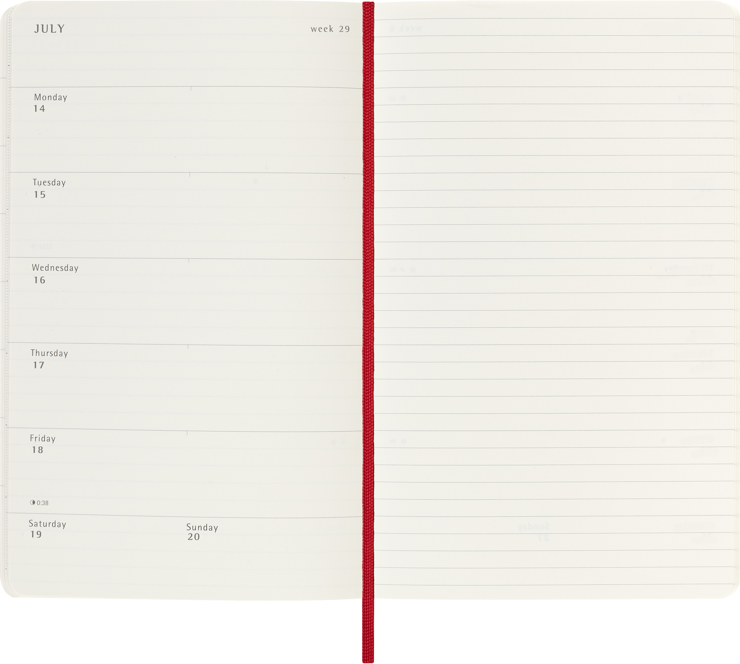 - weicher Einband mit abgerundeten Ecken, Gummiband zum Verschliessen und Lesebändchen