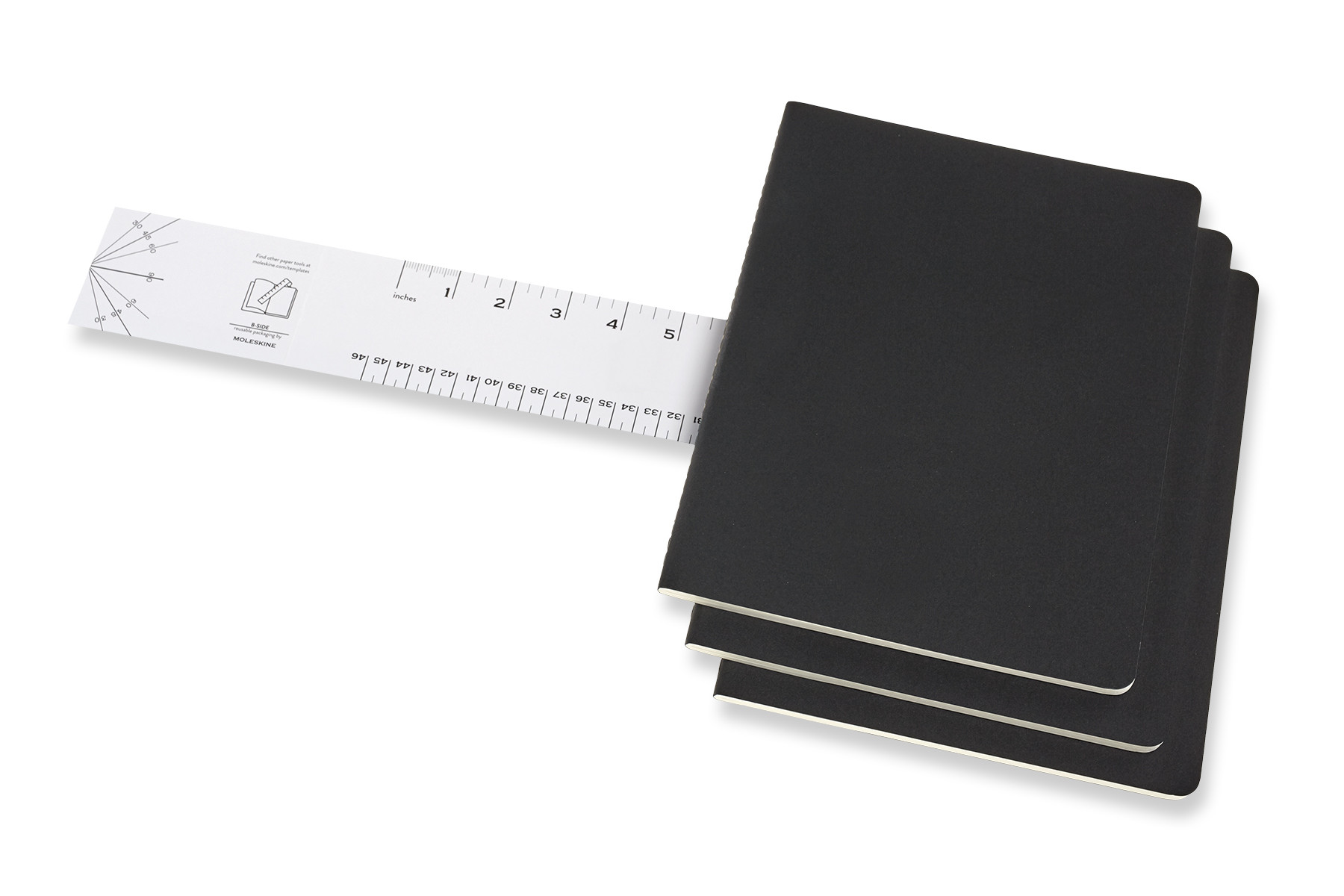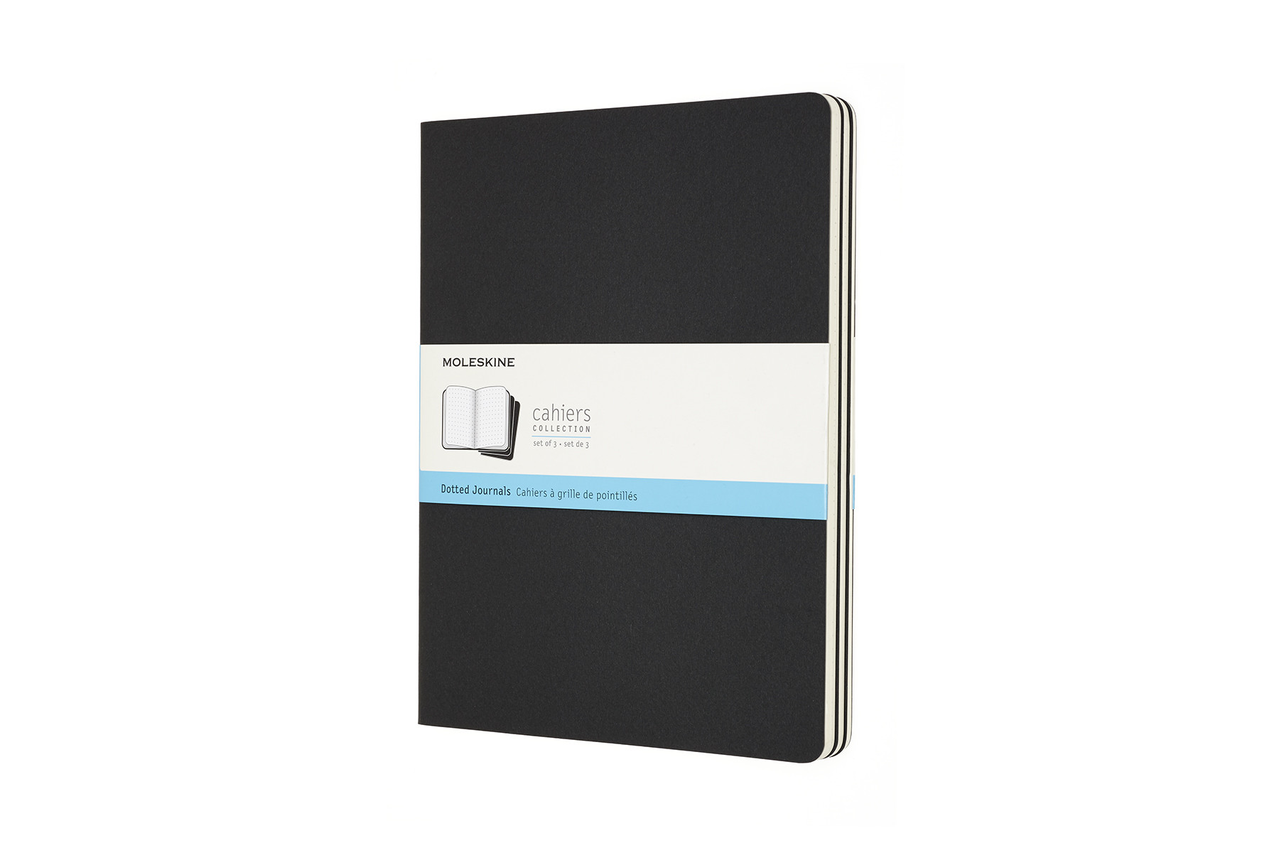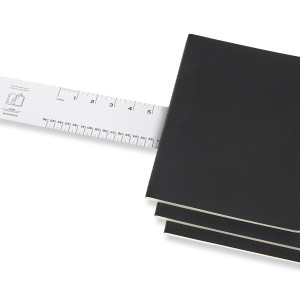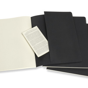 Die Notizhefte haben einen stabilen Einband aus schwarzem Karton mit sichtbarer Fadenheftung. Die letzten 16 Seiten sind heraustrennbar, mit einer grossen Innentasche für lose Zettel und einem Text zur Geschichte von Moleskine. Gepunktetes, chlorfrei gebleichtes Papier. 3er-Set