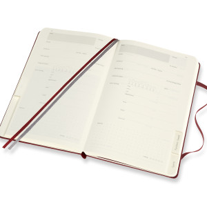 - fester Einband mit themenspezifischer Prägung, abgerundete Ecken, Gummiband zum Verschliessen