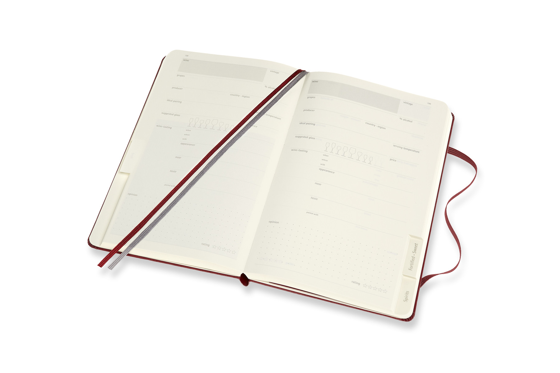 Das Wein-Journal von Moleskine wächst mit Ihren Notizen zu einer Aufzeichnung aller Weine, die Sie mögen. Die ersten Seiten enthalten wertvolle Tipps, wie Sie Ihre Kenntnisse vertiefen können. In den sechs folgenden Rubriken können Sie sich eingehend mit Schaum-, Weiss-, Rosé-, Rot-, Likören und Gebrannten befassen. Jedem Wein ist eine ganze Seite gewidmet, mit strukturierten Bereichen zum Notieren von Rebsorte, Aussehen, Geschmack und vielem anderem mehr.