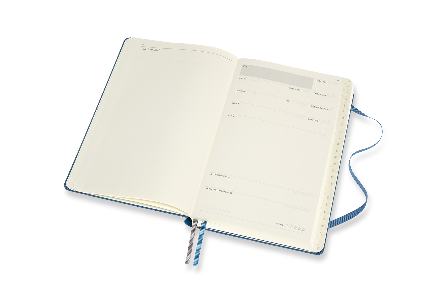 Das Buch-Journal von Moleskine ist dafür gemacht worden, ein persönlicher Katalog all Ihrer gelesenen Bücher zu werden. Von Belletristik bis Sachliteratur. Die alphabetisch sortierten Seiten bieten Ihnen einen strukturierten Raum zum Notieren der Schlüsselinformationen. Ergänzen Sie sie mit Überlegungen, Zitaten und Passagen!
