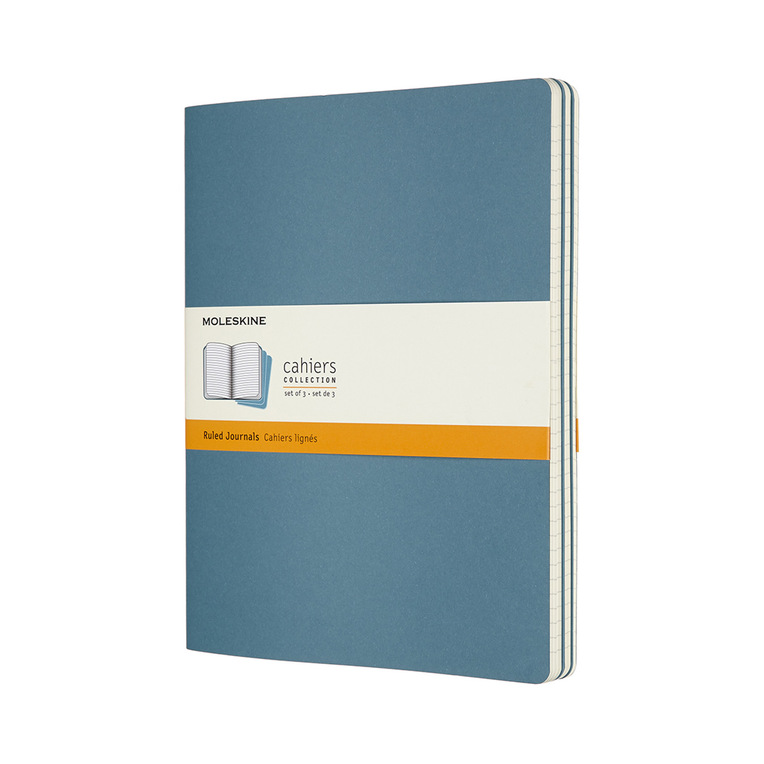 Die Notizhefte haben einen stabilen Einband aus blauem Karton mit sichtbarer Fadenheftung. Die letzten 16 Seiten sind heraustrennbar, mit einer grossen Innentasche für lose Zettel und einem Text zur Geschichte von Moleskine. Liniertes, chlorfrei gebleichtes Papier. 3er-Set
