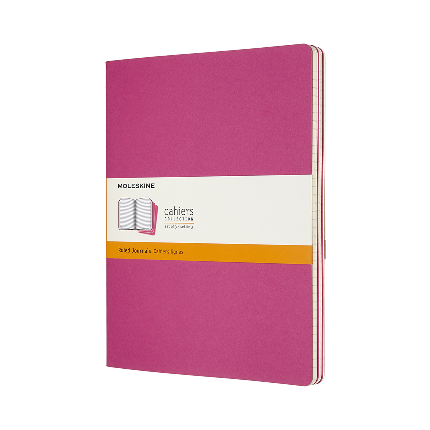 Die Notizhefte haben einen stabilen Einband aus pinkem Karton mit sichtbarer Fadenheftung. Die letzten 16 Seiten sind heraustrennbar, mit einer grossen Innentasche für lose Zettel und einem Text zur Geschichte von Moleskine. Liniertes, chlorfrei gebleichtes Papier. 3er-Set