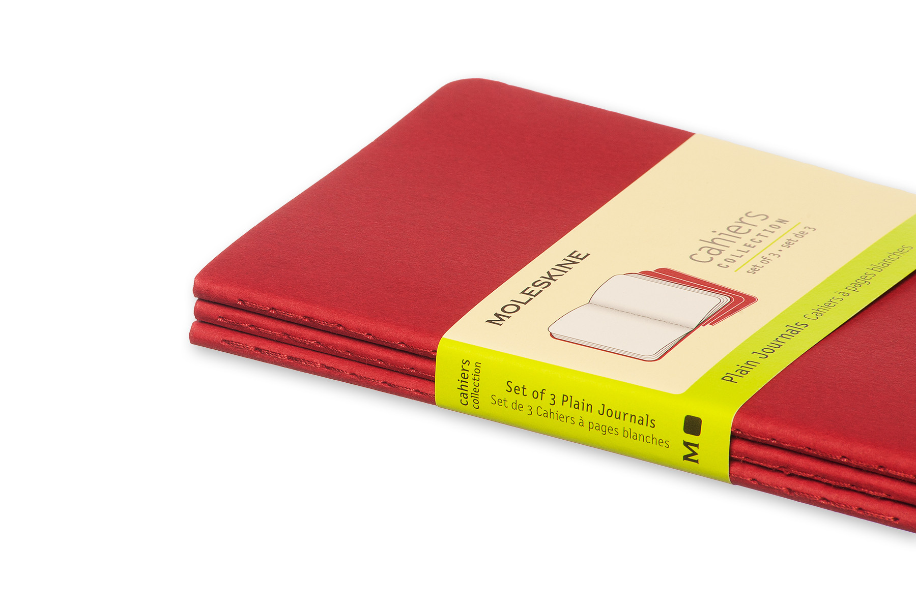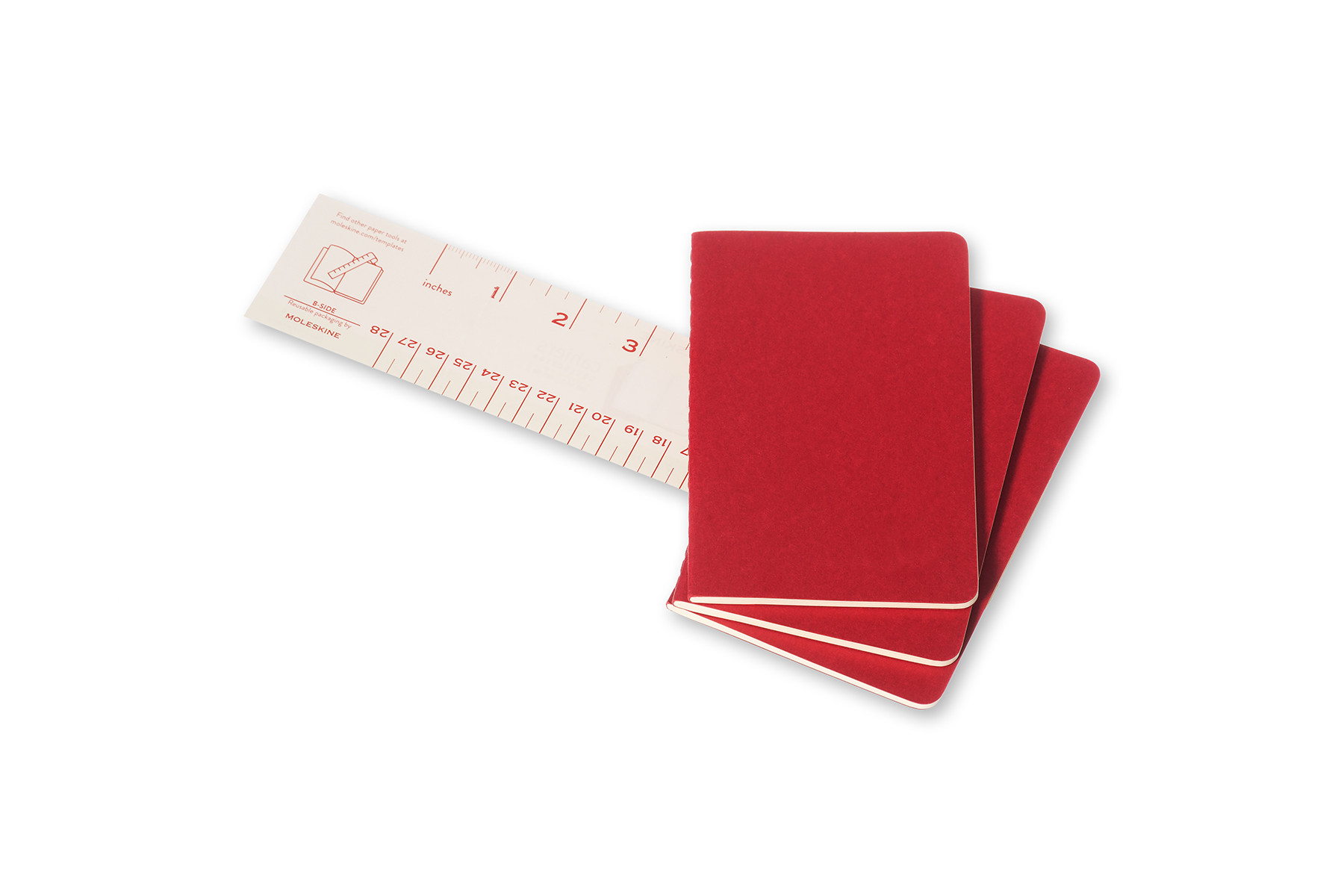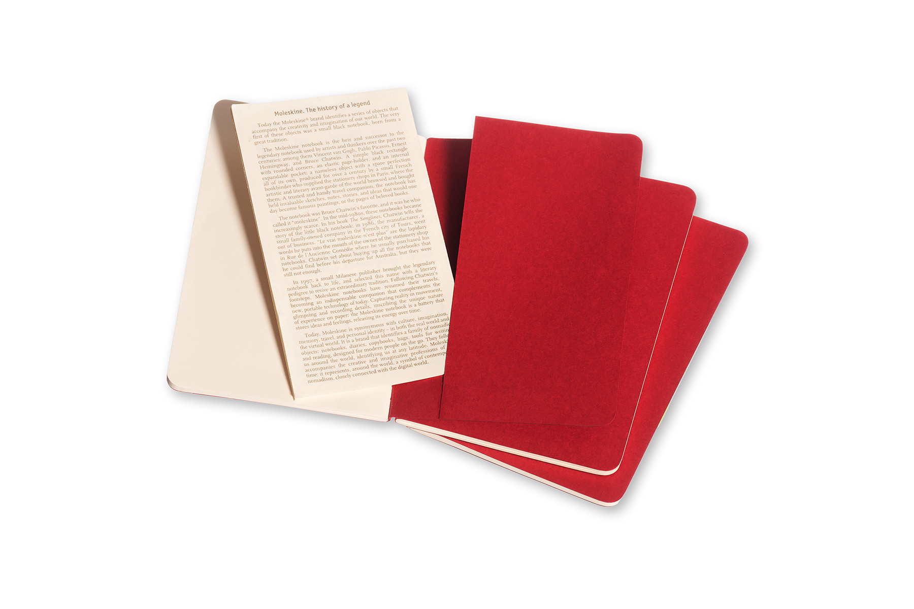 Die Notizhefte haben einen stabilen Einband aus rotem Karton mit sichtbarer Fadenheftung. Die letzten 16 Seiten sind heraustrennbar, mit einer grossen Innentasche für lose Zettel und einem Text zur Geschichte von Moleskine. Blanko, chlorfrei gebleichtes Papier. 3er-Set