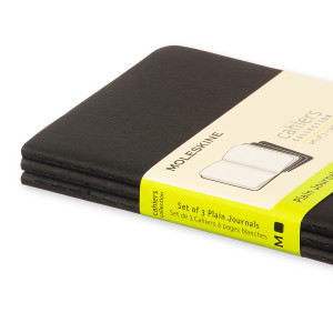 Die Notizhefte haben einen stabilen Einband aus schwarzem Karton mit sichtbarer Fadenheftung. Die letzten 16 Seiten sind heraustrennbar, mit einer grossen Innentasche für lose Zettel und einem Text zur Geschichte von Moleskine. Blanko, chlorfrei gebleichtes Papier. 3er-Set